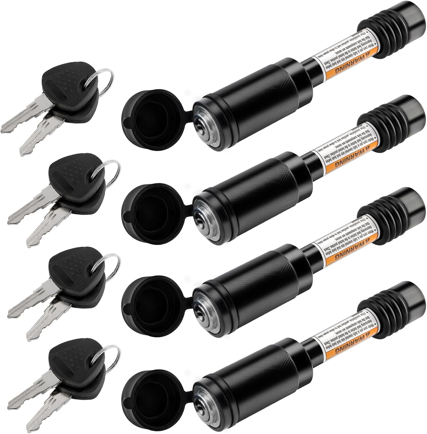 - 【PACKAGE INCLUDES】- It’s a newly upgraded hitch lock with all metal construction. This trailer hitch lock comes with 8 x keys, 16 x Rubber O-Rings, 4 x 5/8" lock pin and 4 x Upgrade button lock head.