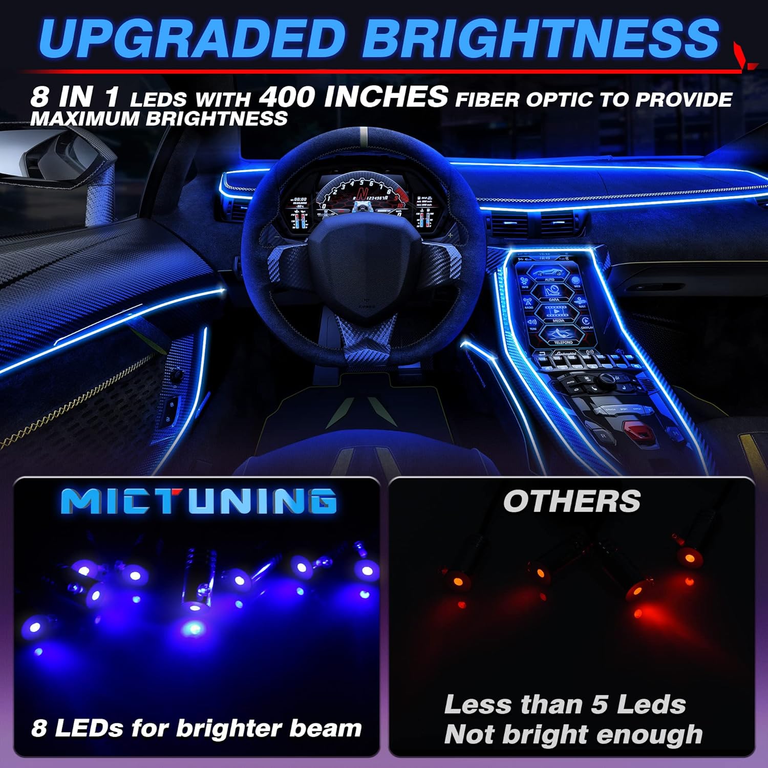 - ★【2025 Upgraded Version, 8 in 1 and 400 inch Design】This interior car light contains 8 LEDs and 400 inches of fiber optic tube. More LEDs and longer fibers than other 5-in-1s, which can be flexibly installed in any car