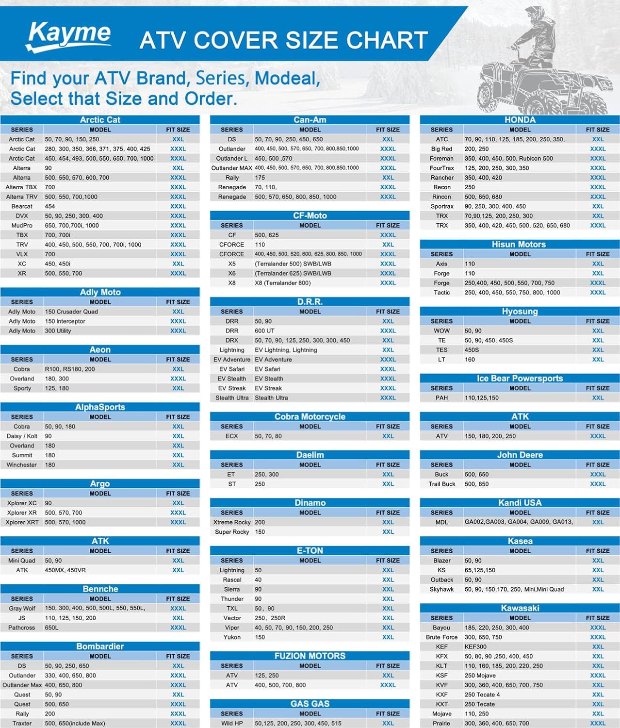 - 【XXXL Universal size】 XXXL-100''L x 43''W x 48''H. ATV cover fit for most ATV. Suit for Polaris,Raptor, Ranger, Suzuki, Honda, Kawasaki, Yamaha, Can-am outlander ATV and more. (To ensure the right size, please measure your ATV before purchasing)