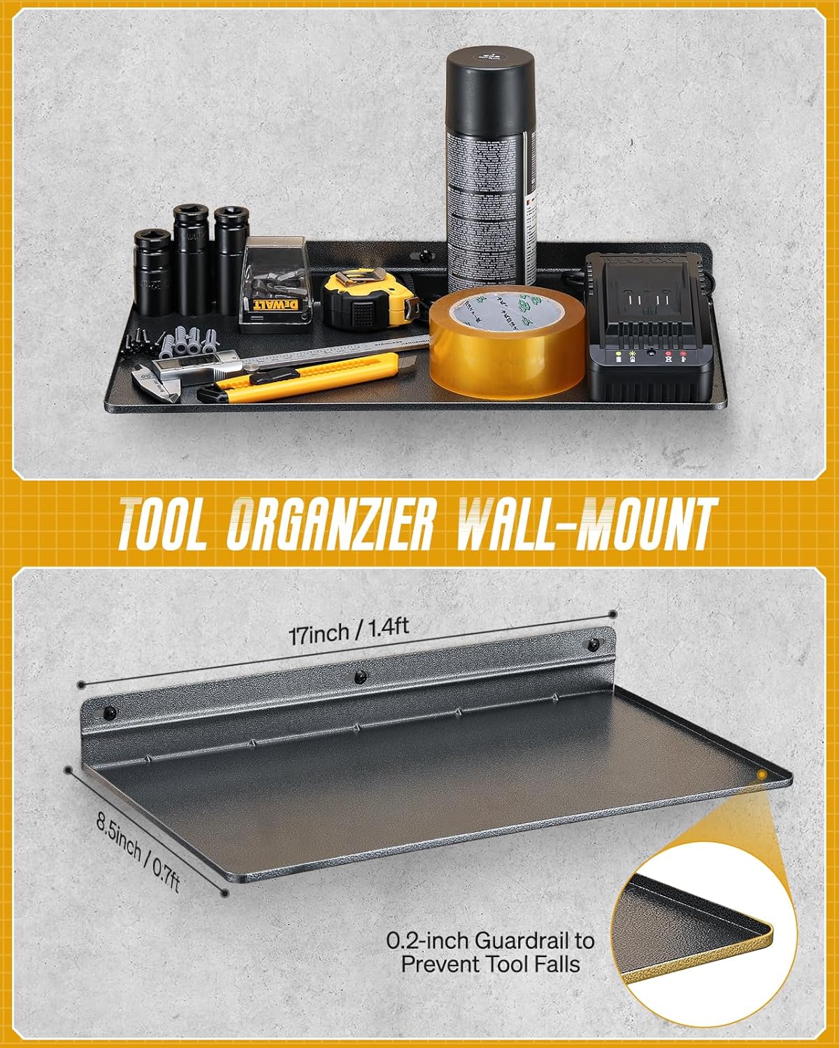 - WALL MOUNT STORAGE BOARD: 17x8.5-inch Organized area, this wall-mounted organizer board includes a 0.2-inch edge railing along the perimeter to prevent tools from falling. You can use it to store additional hand tools.