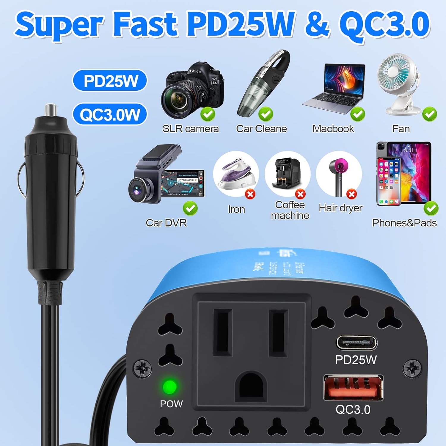 - [ Fast-Charging Version 12v power inverter] Latest brand new power inverter with faster 25W PD & QC3.0 ports, more silent cooling fan, more thicker, more stronger and higher power convert efficiency.