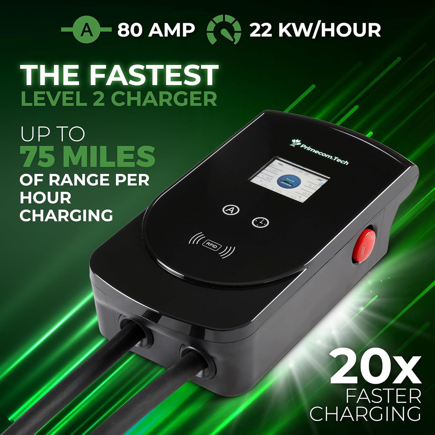 - ⚡【 HIGH POWER - 80 AMP - UP TO 75 MILES OF RANGE PER HOUR CHARGING 】— Up to 20 times faster than a standard 110V charger, providing up to 75 miles of range with every hour of charge, delivering up to 19.2 kWh. The Primecom 80Amp EV Charger offers adjustable amperage ranging from: 80A, 50A, 48A, 40A, 32A, 30A, 28A, 24A.
