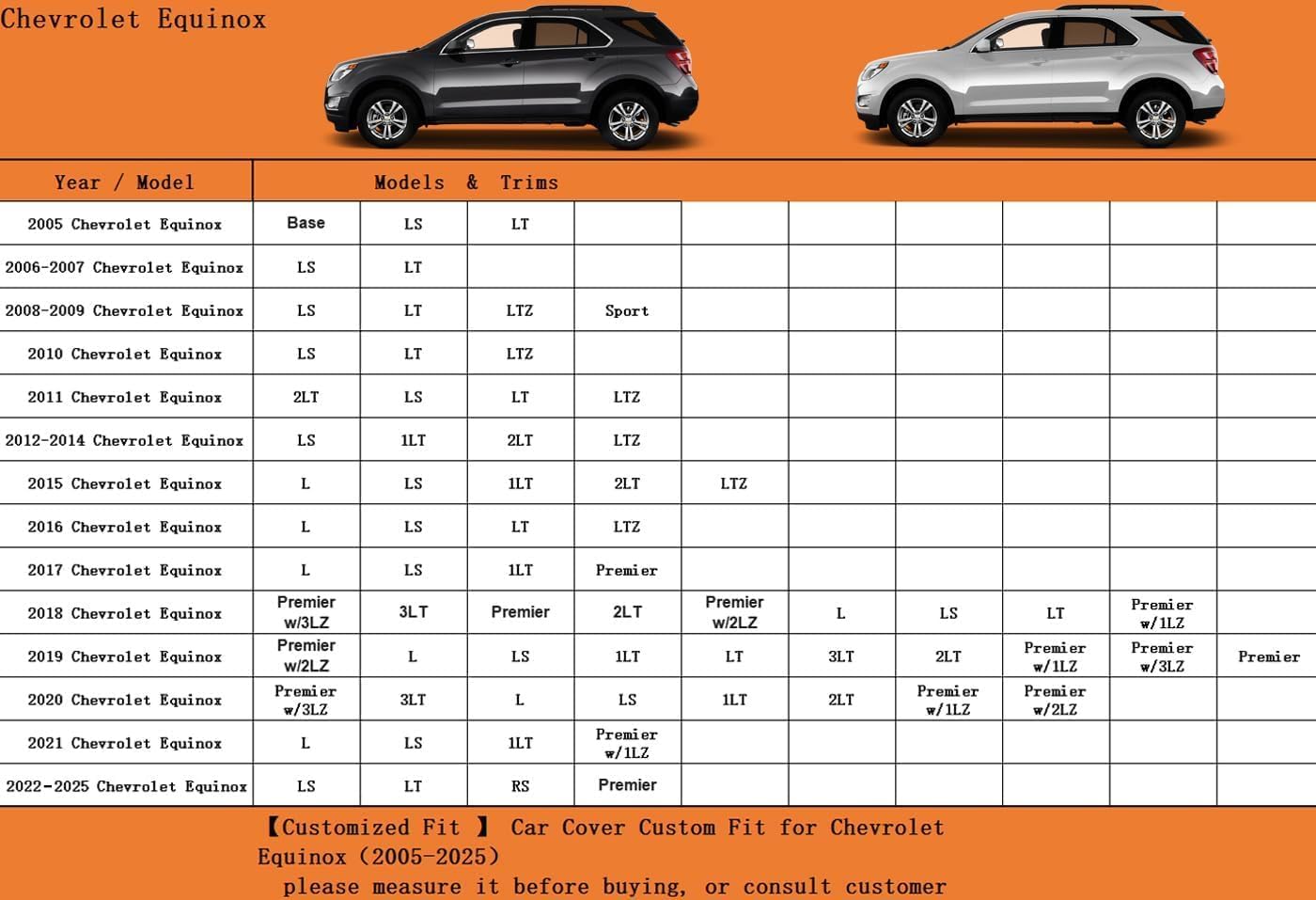 - 【Suitable for】— Custom fit for Chevrolet Chevy Equinox (2005-2025). Come with a large enough portable bag to store your cover when you do not use