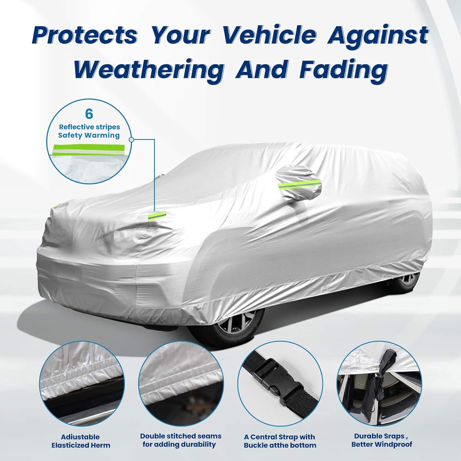 - All-Weather Protection: Car cover 100% waterproof all weathers. Car cover can achieve the effort of Sunproof, Windproof,Hailproof,Snowproof, Dustproof Scratch resistant and protect your vehicle from odirt, UV pollutants,Sand, Leaves, Branches, Snow, Rain, Frost, Birds Dropping