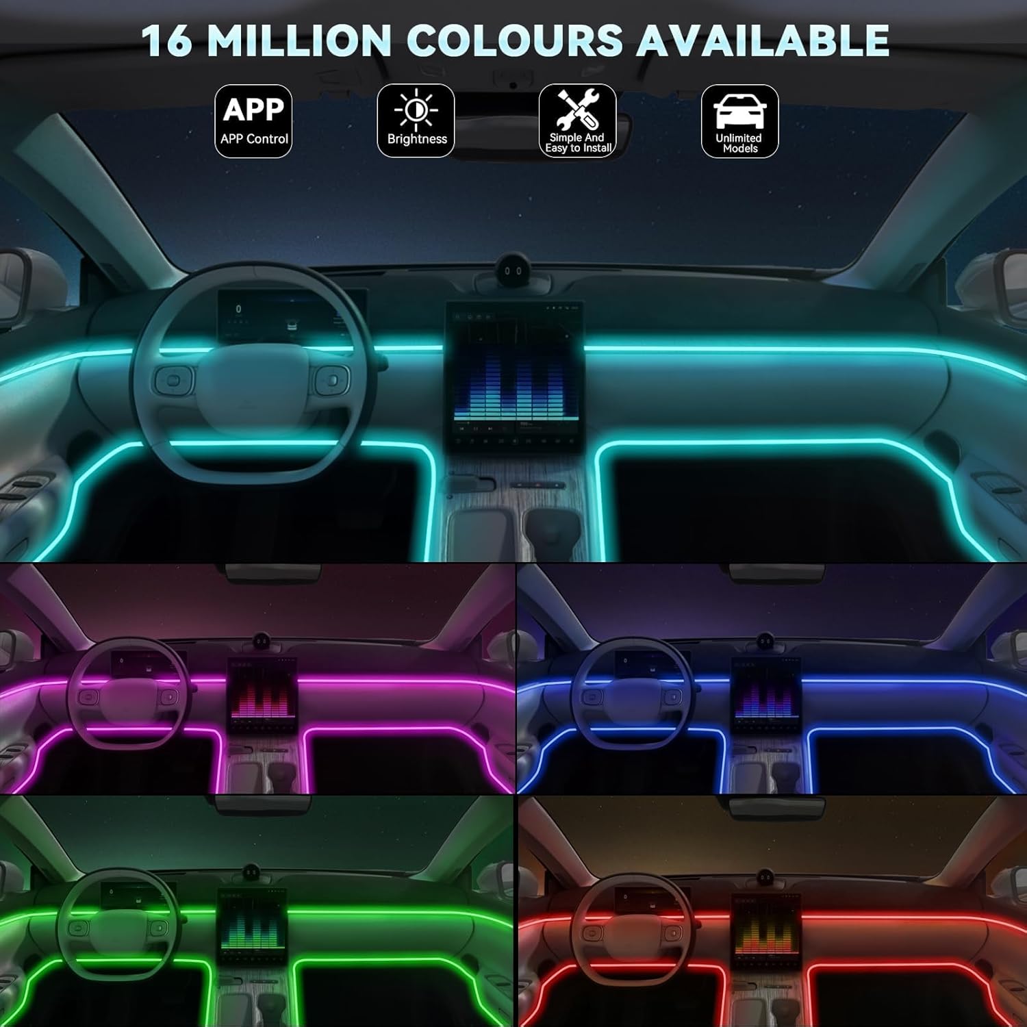 - Wide Application: The product is very easy to use and is suitable for almost all cars, trucks, SUVs, boats, and also can be used as decorative lights for home, bedroom, party. Plug and play. You can cut it according to the length of each strip you need. The car RGB interior lights is easy to install and hide. DIY whatever you like.