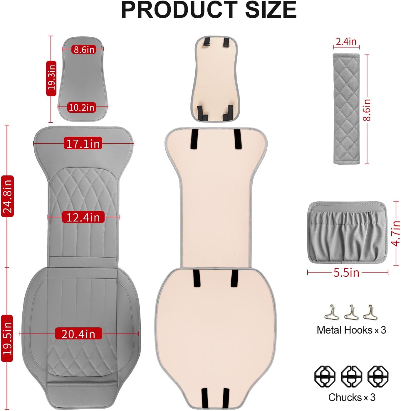 - Package Includes:car seat cover*1, car pocket organizer*1,car seat belt pad*1,metal hook*3, chuck*3,installation manual * 1.Please contact us if you have any questions about the product, and we will reply you within 24 hours.
