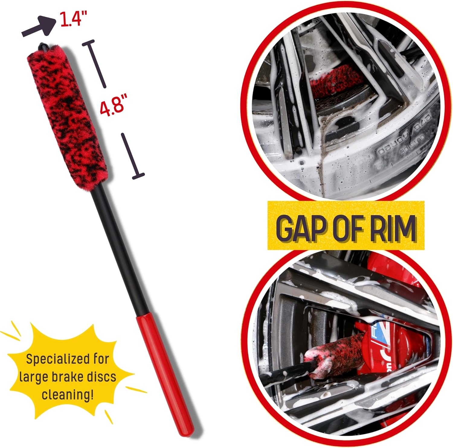 - SPECIAL DESIGN FOR LARGE CALIPERS: Normal size angled wheel brush handle the surface jobs, and the slim wheel barrel brush handle the tight, deep inside wheel wells jobs! It can go through most large calipers and give those tight spaces a thoroughly detail cleaning