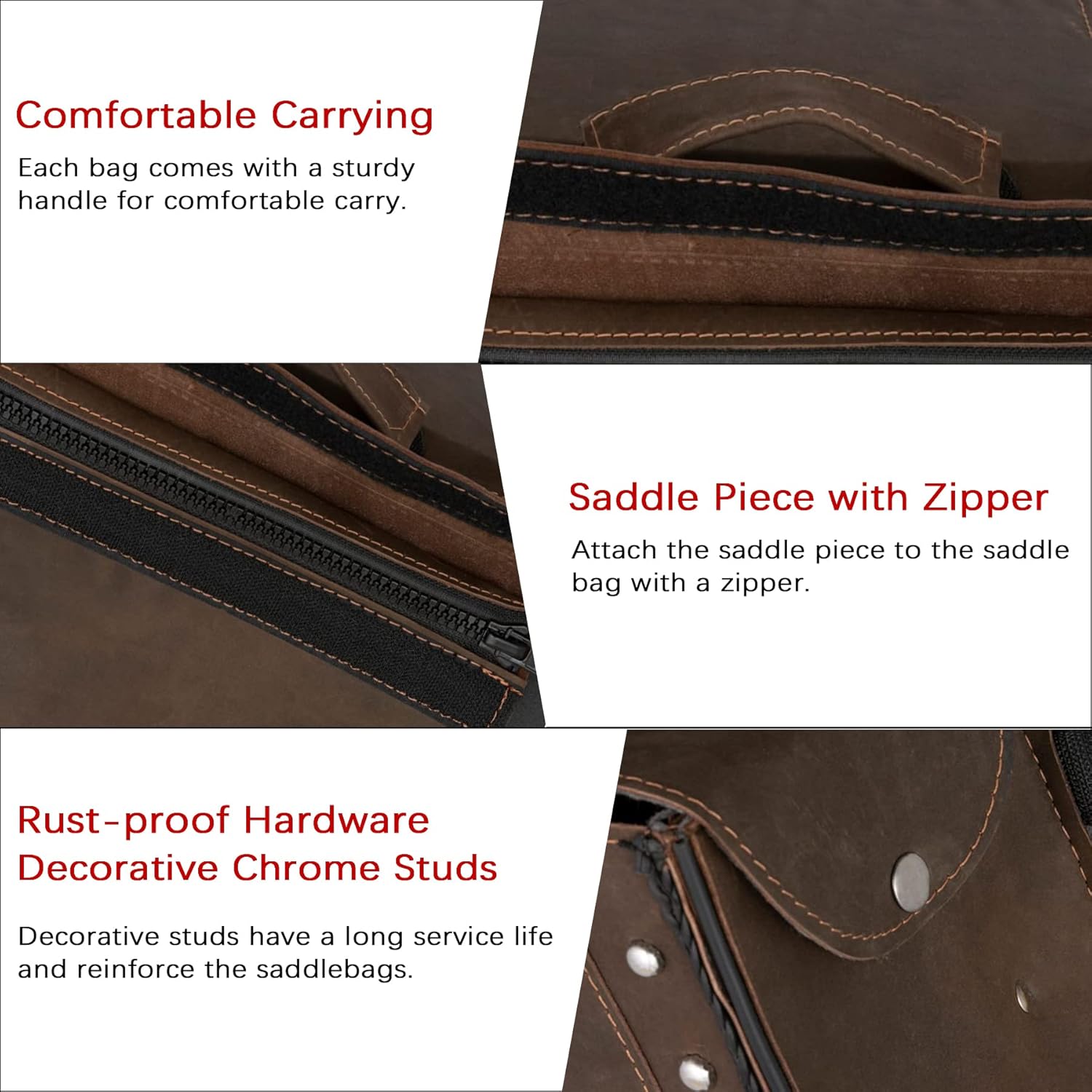 - [Naked Cowhide Leather Saddlebags] - The motorcycle saddle bags are made of genuine naked cowhide leather. Quality leather construction ensures the durability of the saddle bags and keeps your stuff dry from being wet by rain. Leather material resists dust and makes the saddlebags easy to clean. Thick leather and reinforced stitching ensure strong tear resistance of the leather motorcycle side bags.