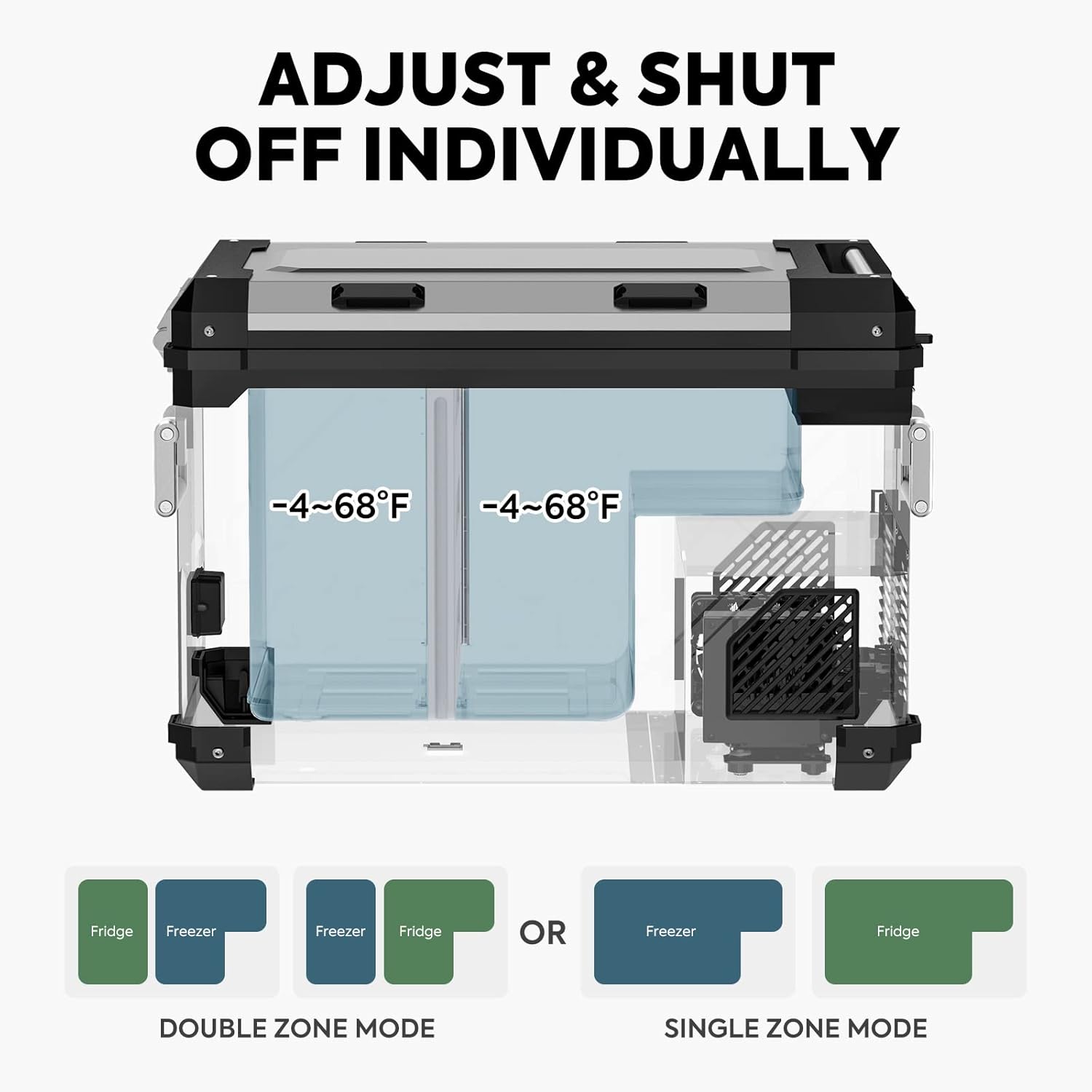 - Flexible Dual Zone Design - APL55 dual zone fridge add removable divider design that allows automatic switching between single and dual zone mode by removing the partition, providing 2 separate zones for refrigeration and freezing with 2 independent digital controller.