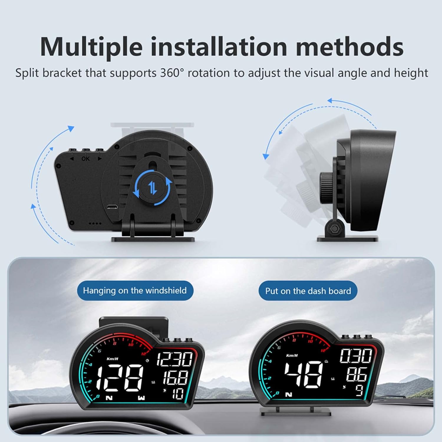- EASY TO INSTALL: Our in-car smart speedometer display features easy plug-and-play operation. Simply mount the unit near the dashboard. It is powered via the included cigarette lighter USB cable. There are two ways to mount it: on the car's center console with a non-slip sticker, or on the front windshield or A-pillar with a swivel bracket, depending on where you prefer to place it.