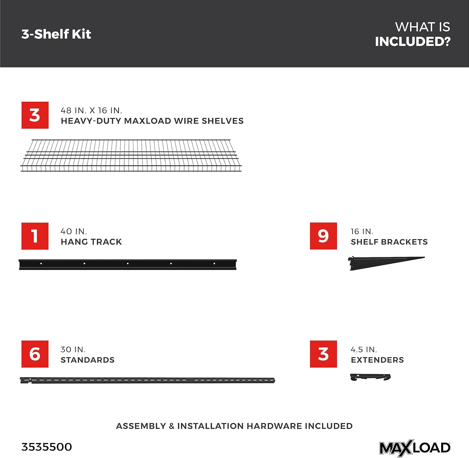 - ALL IN ONE SHELF KIT: Includes two 4 ft. W x 16 in. D MaxLoad shelves, hang track, standards and all hardware to install; Shelf kit ideal for organizing garage spaces or utility rooms