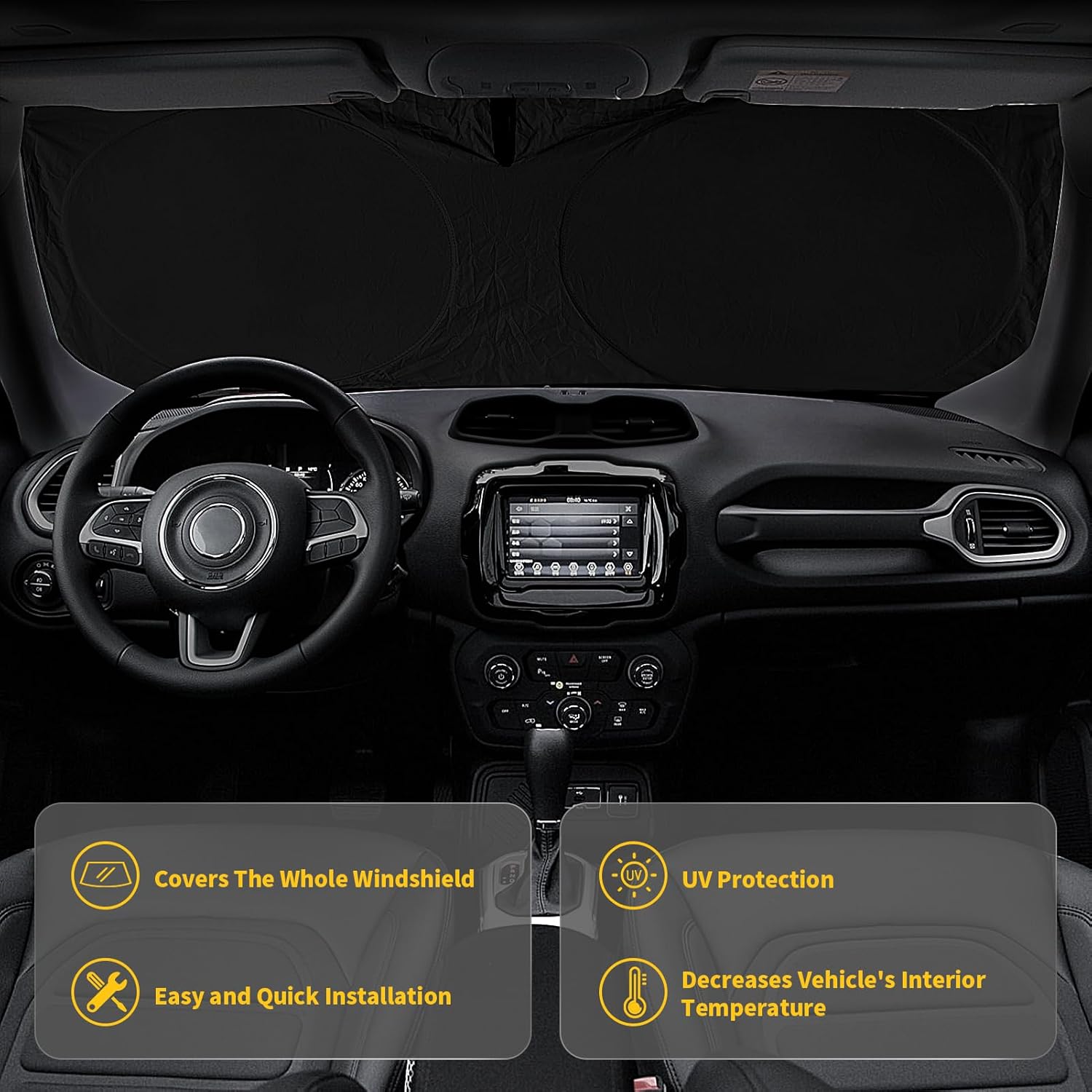 - ★【Size of window sun shade】Automotive windshield sun shade is 152X80 cm(59.8*31.5''),which replacement for Jeep Renegade SUV 2015-2023,2007-2017 Jeep Patriot SUV. We have several size of car sunshade. Please measure your car size and refer to our size before your purchase.