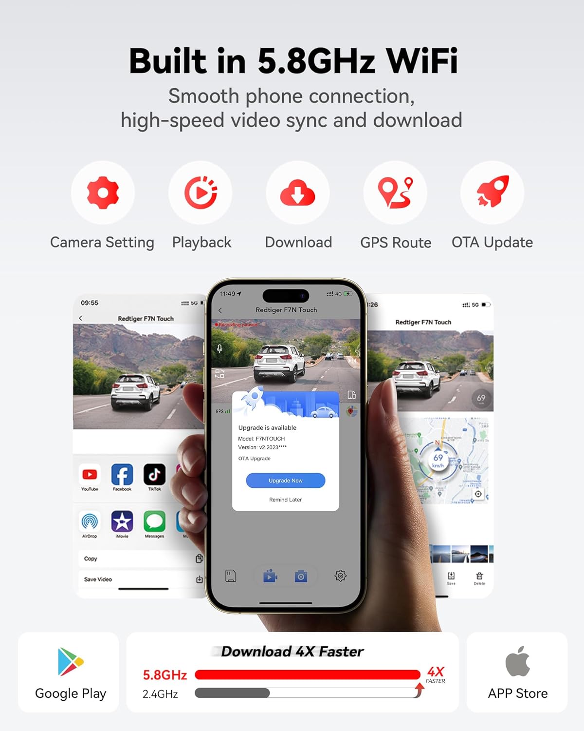- [Built-in GPS & 5.8GHz WiFi] Both Android and IOS users can connect to dashcam WiFi via the REDTIGER app. Although the dash cam is installed wired, you can enjoy wireless control on your smartphone, quickly access your recorded videos and share your driving experiences in real-time with friends and insurance companies. Car recorder built-in GPS provides traceable location, speed, and accurate route in the recordings.