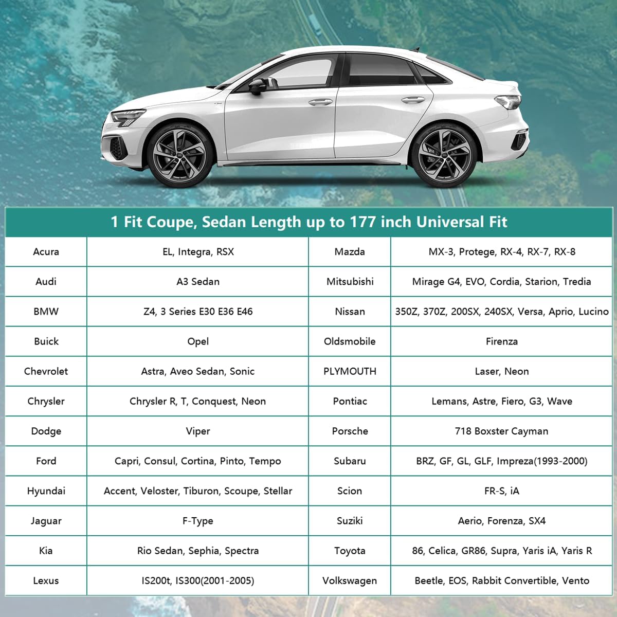 - 【Model Choice】GUNHYI automobiles cover is suitable for Coupe, Sports, Sedan, Length up to 177 inch (Not for SUV Hatchback). For exmaple-Audi TT, Porsche 718/Boxster/Cayman, BMW Z4, Toyota 86/Supra, Mazda RX-8, Subaru BRZ, Nissan 240SX/370Z/Versa, Hyundai Accent, vw Beetle, Dodge Viper etc.