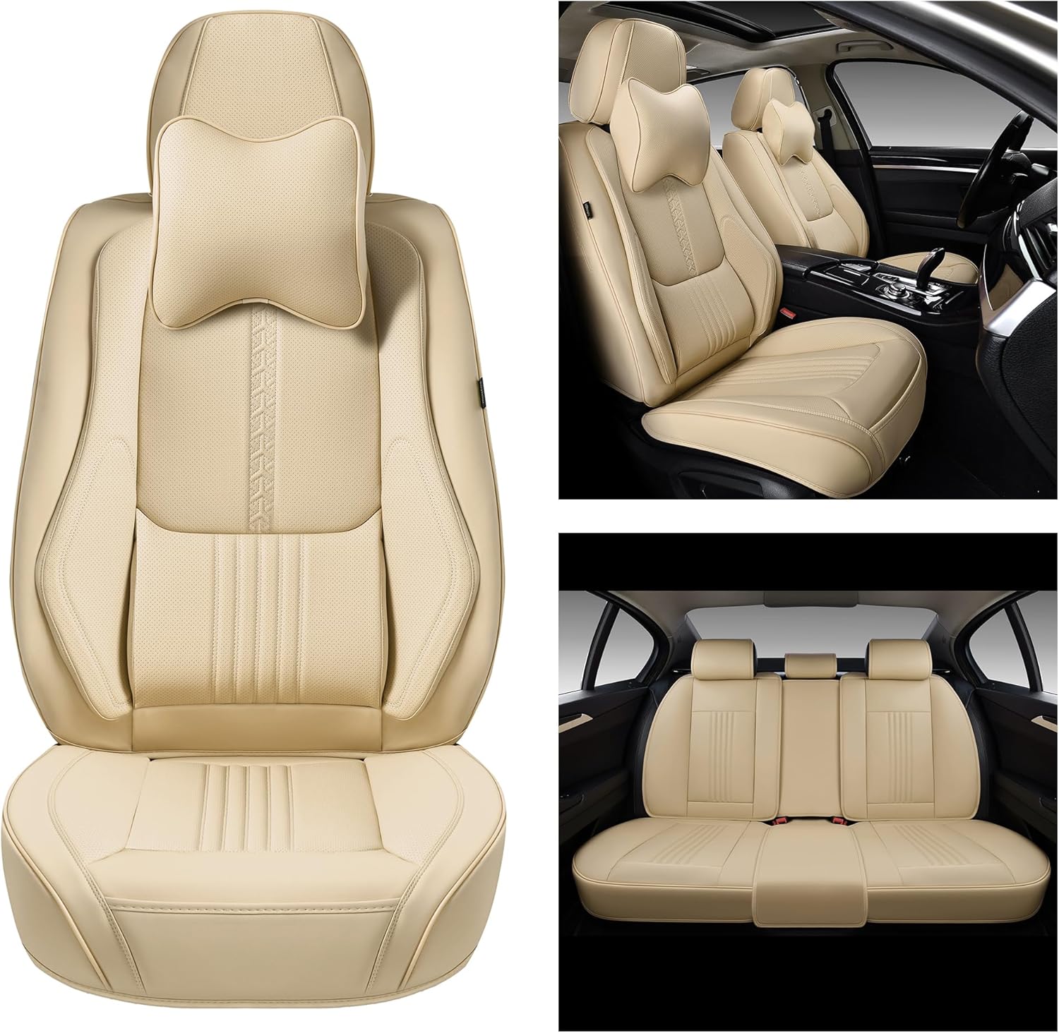 Car Seat Covers Full Set, Front and Rear Seat Covers for Cars, Waterproof Leather Auto Seat Protectors with Head Pillow, Car Seat Cushions Fit for Most Sedans SUV Pick-up Truck, Beige