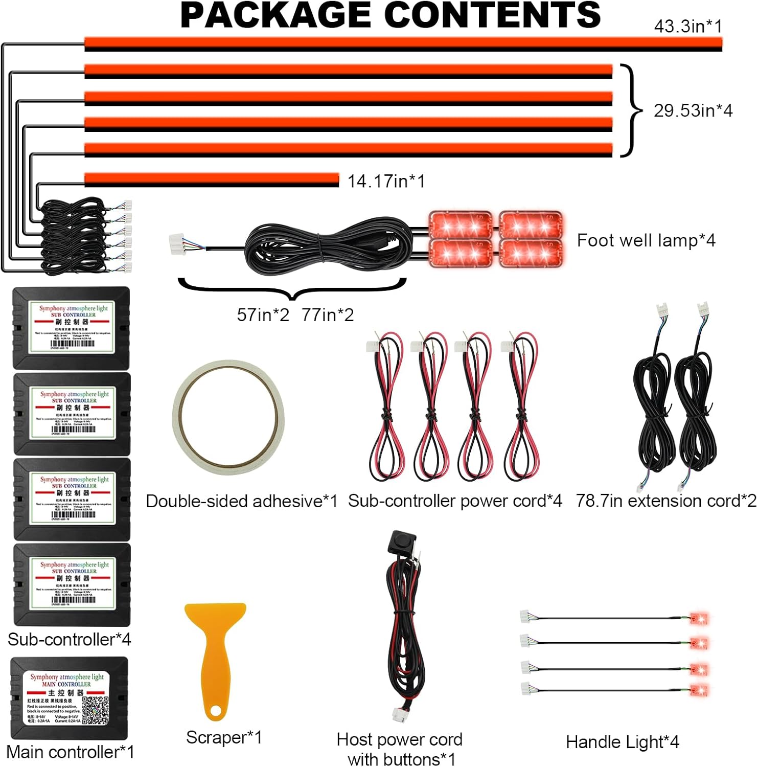 - 🚚Car Ambient Light Design: AMKI car led lights includes 6 acrylic fiber optic light strips (1*14inch+4*29.5inch+1*43inch, with 593 LEDs), 4 under dash lights, 4 door handle light, one master controller and 4 slave controller, all required installation tools are included, easy to install,without worrying about exposed wiring or an untidy look.