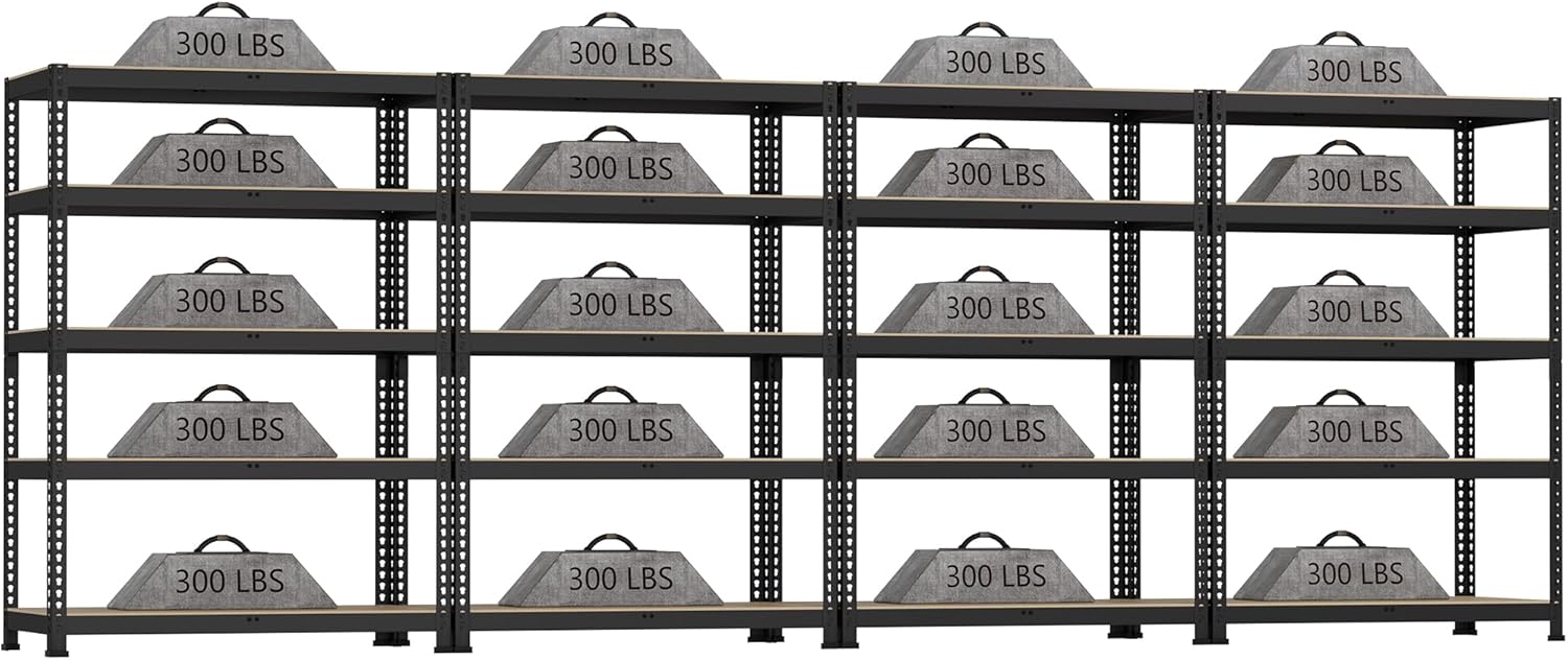 - - Built to Hold More: Featuring a heavy-duty metal frame and premium MDF boards, BuxWellBang garage storage shelves Max. load capacity is 300 lbs per layer shelf (evenly distributed) without buckling or breaking, 5 tier shelves' total max load capacity is 1500 lbs. The rock-solid construction of storage shelf ensures greater strength, longevity, and stability—a storage rack you can trust for the long haul