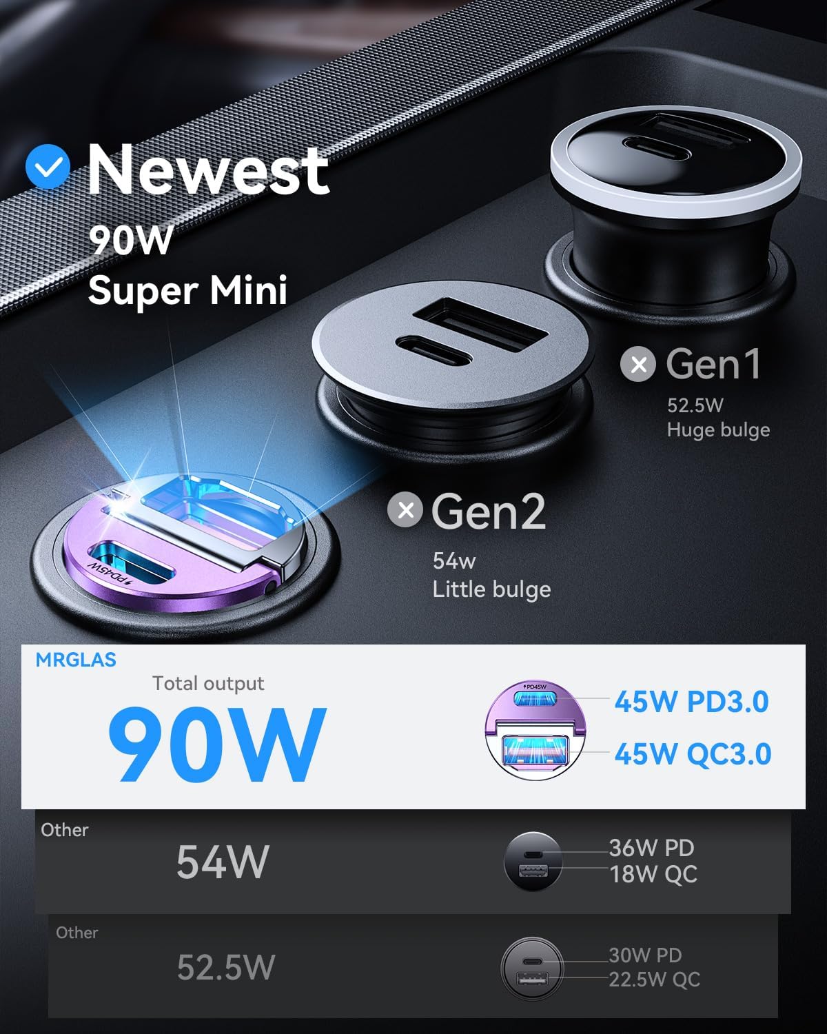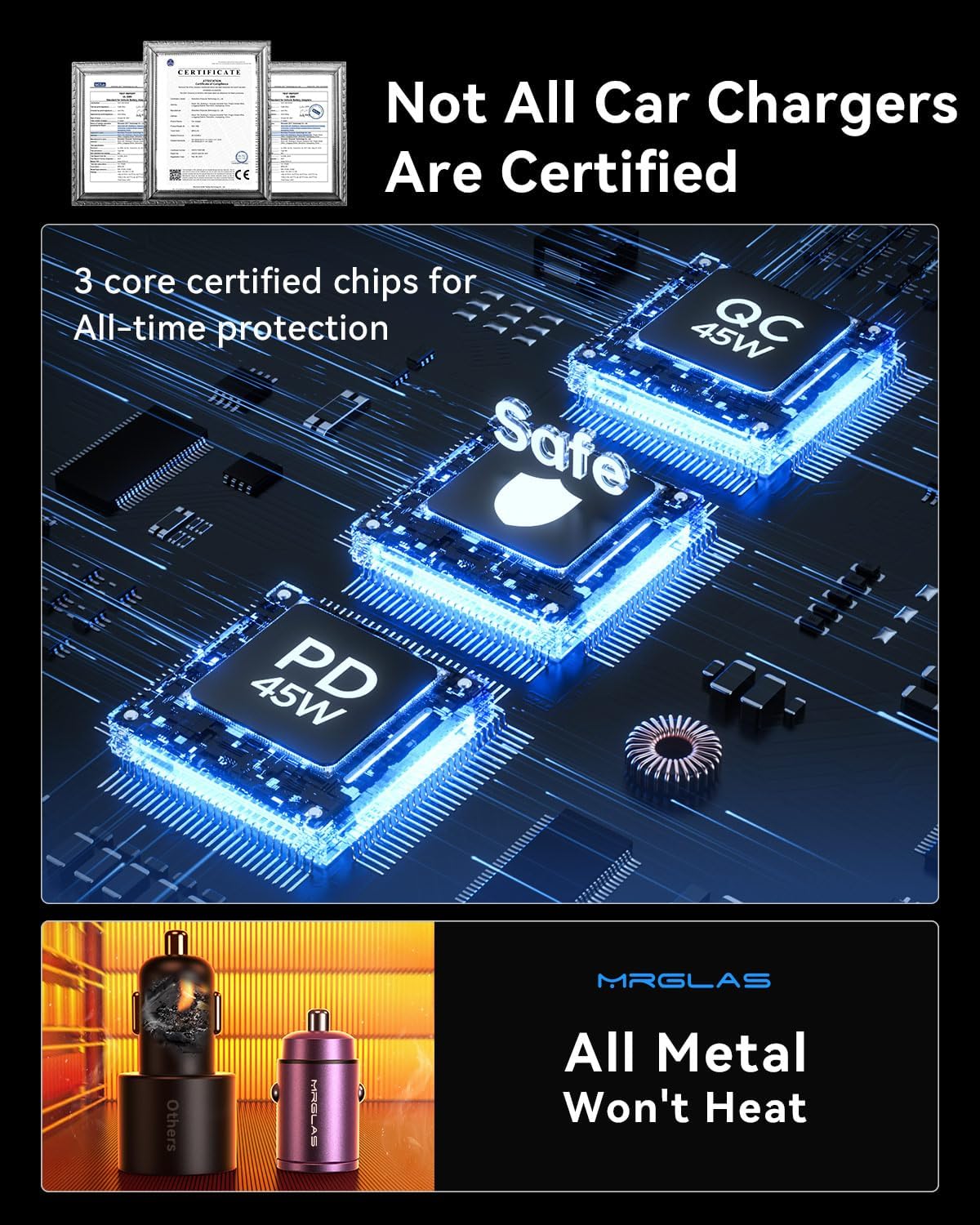 - OFFICIALLY APPROVED CHIP, AIM FOR FASTER & SAFER: MRGLAS fast car charger adapter Built-in PD45W&QC45W dual-core intelligent identification chip outputs 45W of fast charging current in each of its two cores, And the latest security control chip, which is a safe and high-speed Fast Car Charger without damaging the device