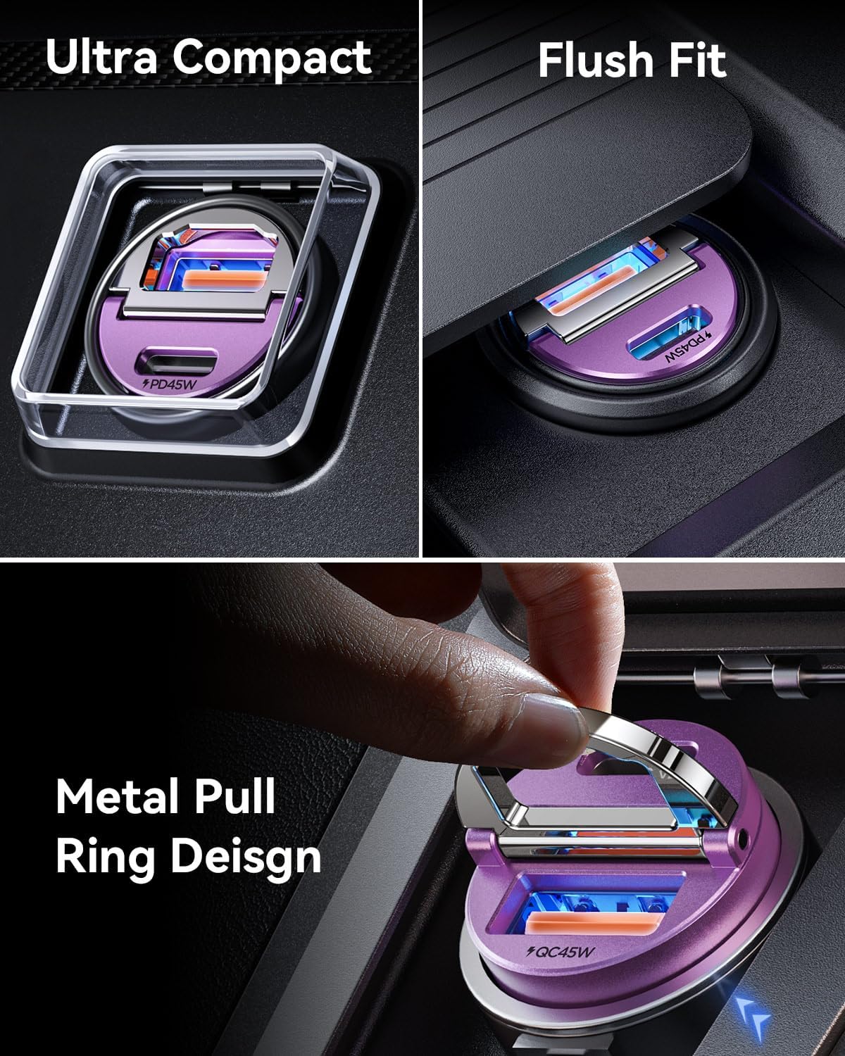 - THUMB-SIZED, PULL RING DESIGN: The smallest flawlessly cigarette lighter usb charger on the market until now. With a tiny-sized body, fits snug and flush into the lighter outlet does not protrude which perfectly hides in your cigarette lighter adapter. Never popup while driving and won't block the cover of the cigarette lighter. So we designed a pull-ring to help you unplug from the car cigarette lighter easier