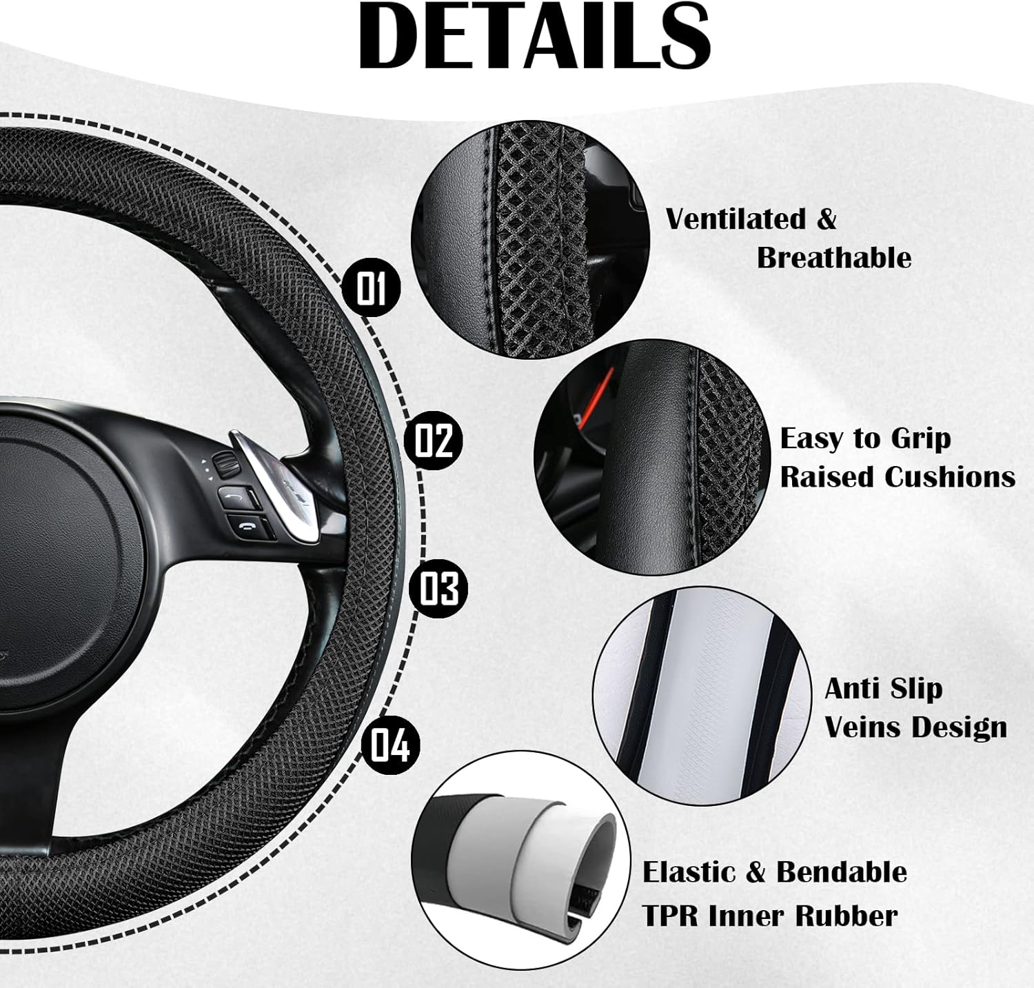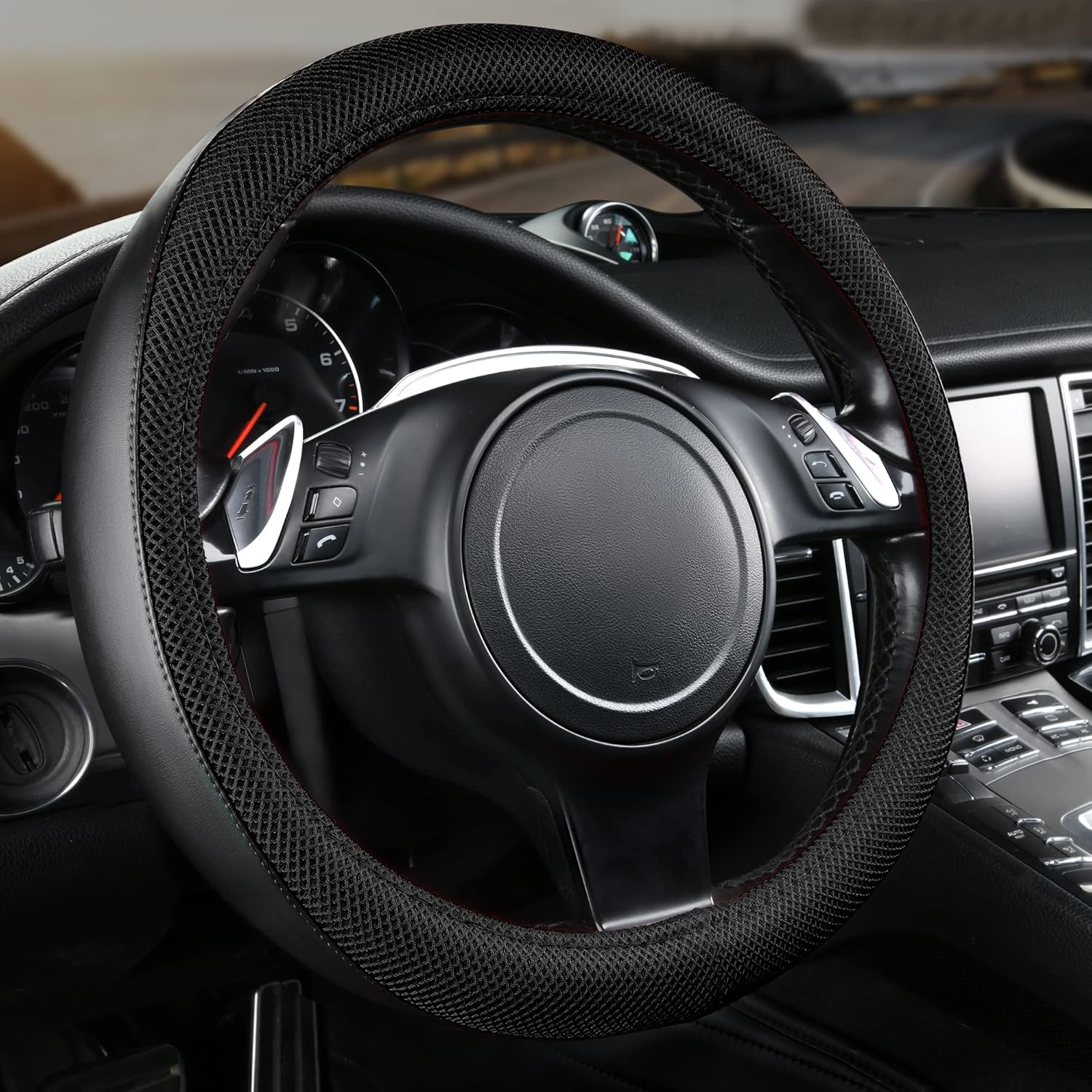 CAR PASS 3D Air Mesh Car Seat Covers Full Sets w/5mm Sponge, 4Pcs Waterproof Car Floor Mats, Steering Wheel Cover Universal Fit for SUV Sedan Truck, Airbag Compatible Automotive Interior(Black)