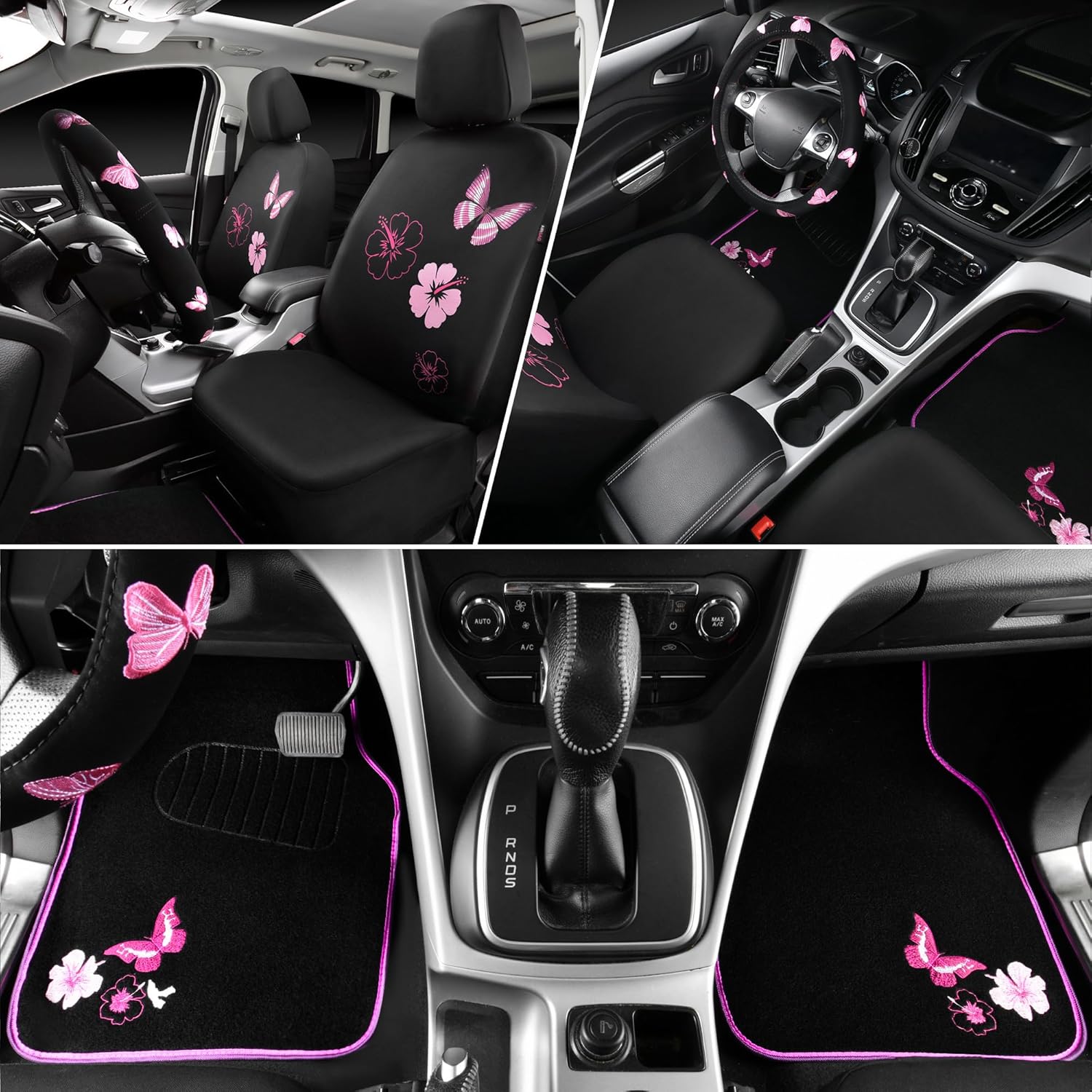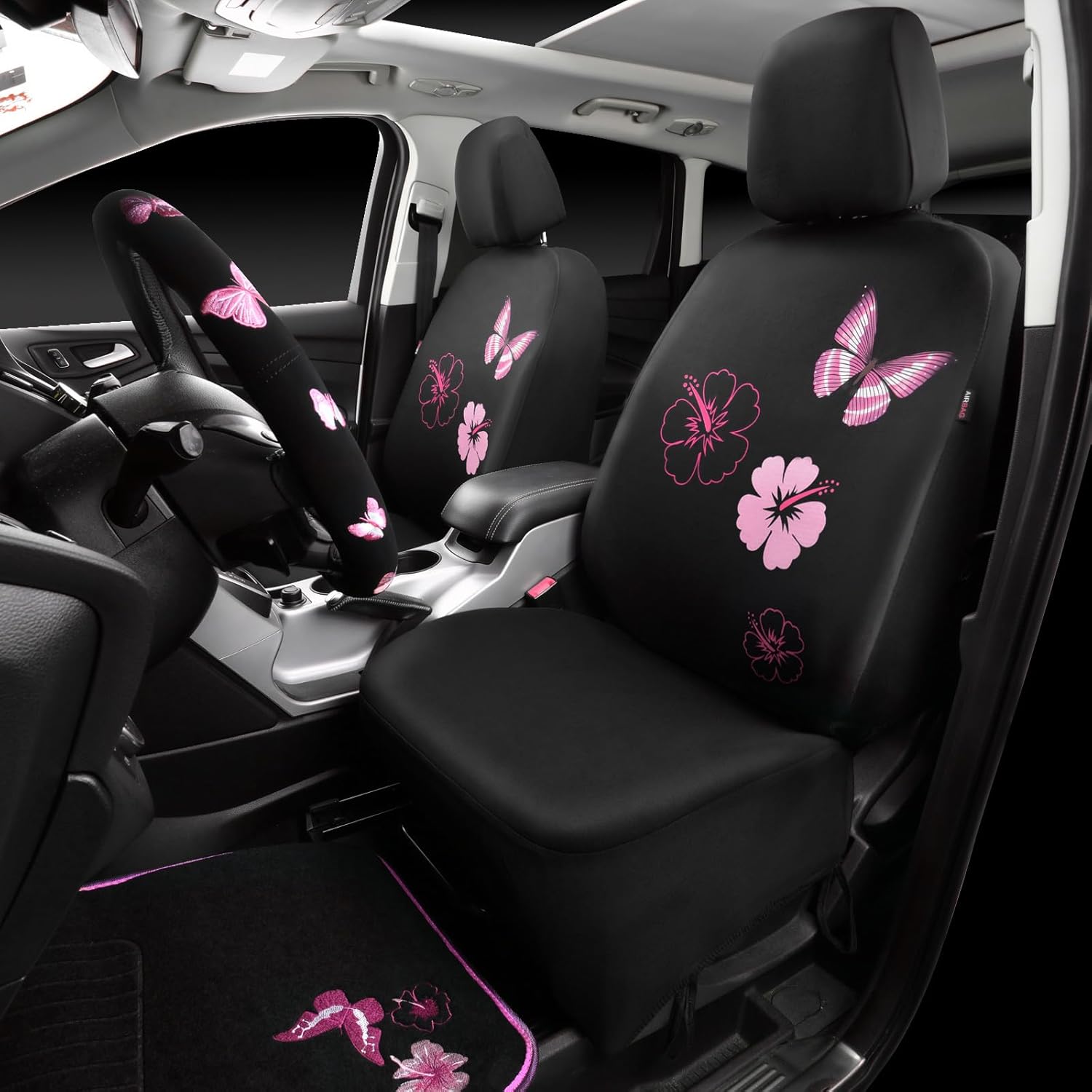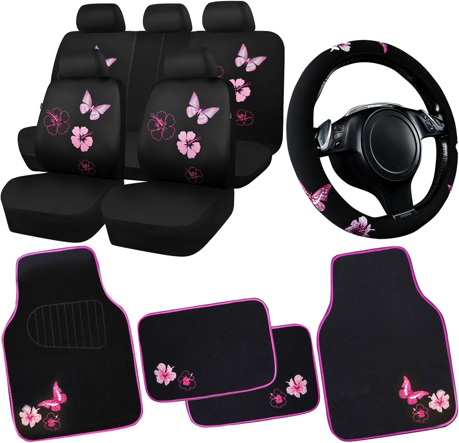 - 【Complete Car Interior Accessories】Includes a full set of butterfly seat covers, 4 butterfly floor mats and a butterfly steering wheel cover to give your car a new look.