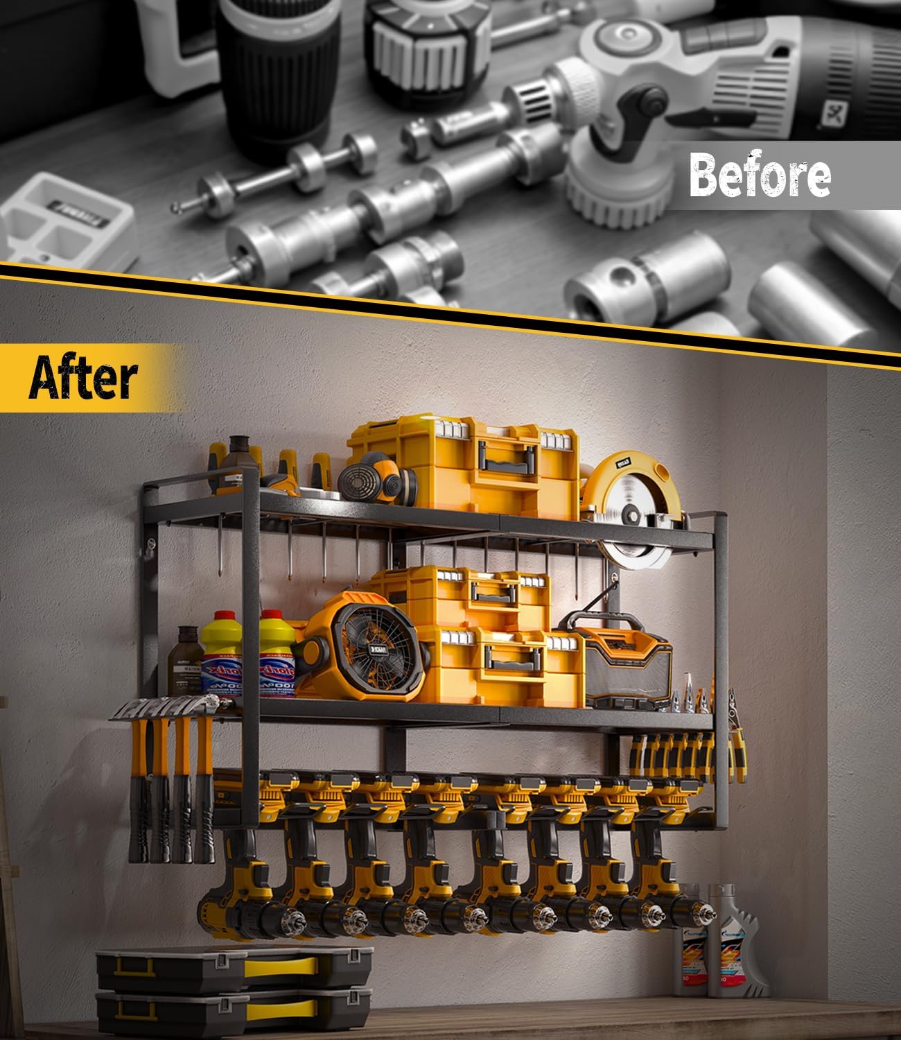 - A BIGGER, MORE OPTIMIZED STORAGE RACK: Sick of lacking enough room to fit power tools? Enter the SOYEEZE wall-mounted power tool organizer - designed for all power tools and their compatible accessories. With three levels of space, each with its purpose, the lower part can hold up to 8 heavy power tools,your tools will be organized and easy to find.
