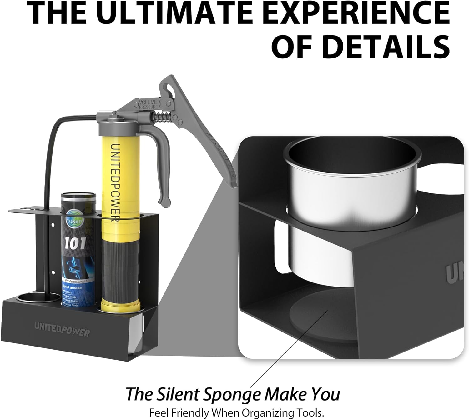 UNITEDPOWER Grease Gun Holder, Wall Mount Grease Gun Storage Rack, Organizer for Workshop, Shop, Garage with Removable Drip Cups & Spare Cartridge Holder