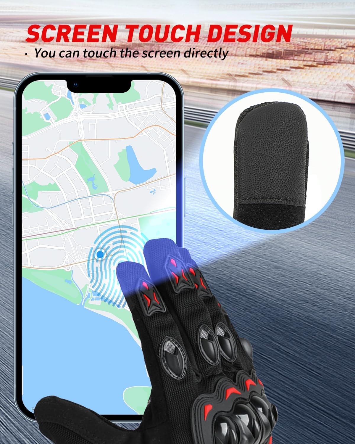 - 【Touch Screen Design】: Motorcycle riding gloves are design with touch screen function on the index finger,thumb,and middle finger tips. the gloves work with all touch screen devices in alll weather without taking off the glove.