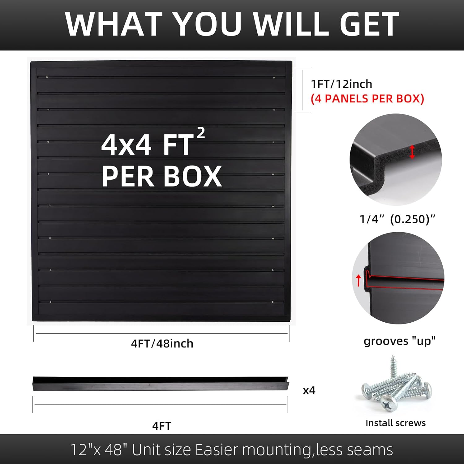- ADAPT TO CHANGING NEEDS: Our durable garage slat wall panel system includes four 4ft x 1ft slatwall panels, offering a coverage of 16 square feet. Whether used individually or in combination, these slat wall panelings allow you to create the perfect setup that suits your needs. If you need extra slat wall storage organizer space, you can effortlessly expand and customize your ideal configuration by adding more garage slatwall panels. Meet evolving needs with personalized storage flexibility.