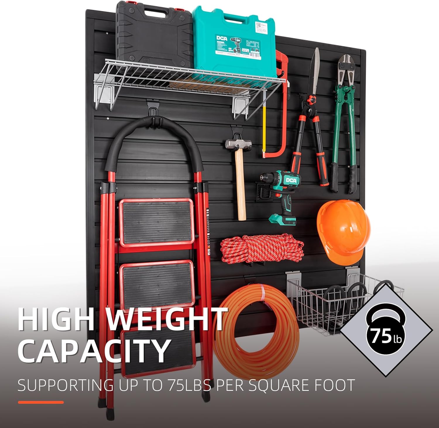 - MAKE FULL USE OF YOUR SPACE: Unleash the true potential of your garage wall organizer for tools with the garage slat wall panel. By making smart use of vertical wall space, you can revolutionize your garage into a seamlessly organized and efficient area. Bid farewell to a messy garage and welcome a meticulously optimized space that maximizes every inch available. Enjoy effortless access to your tools, equipment, and accessories, all while crafting a visually captivating environment.