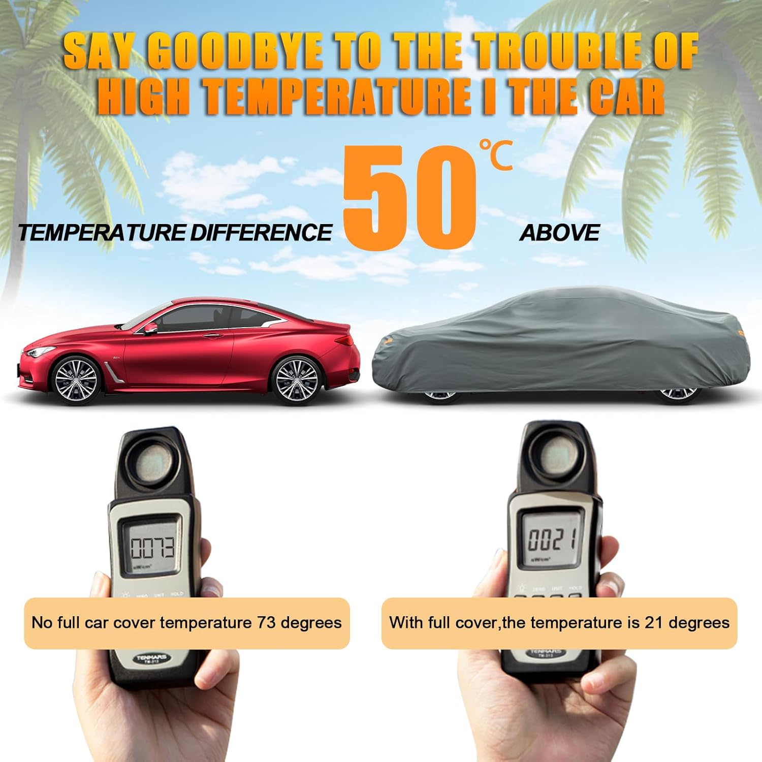 - 【Unique Design】1.Three windproof belts can protect your car cover from being blown away by strong winds. 2.Double seam technology is used to make the car cover more tightly stitched and more durable than most similar covers. 3. 4 transverse orange reflective strips ,remind other people in the night, avoid accidents in dark environments. 3.The elastic hem at the bottom makes the car cover fit the car better.