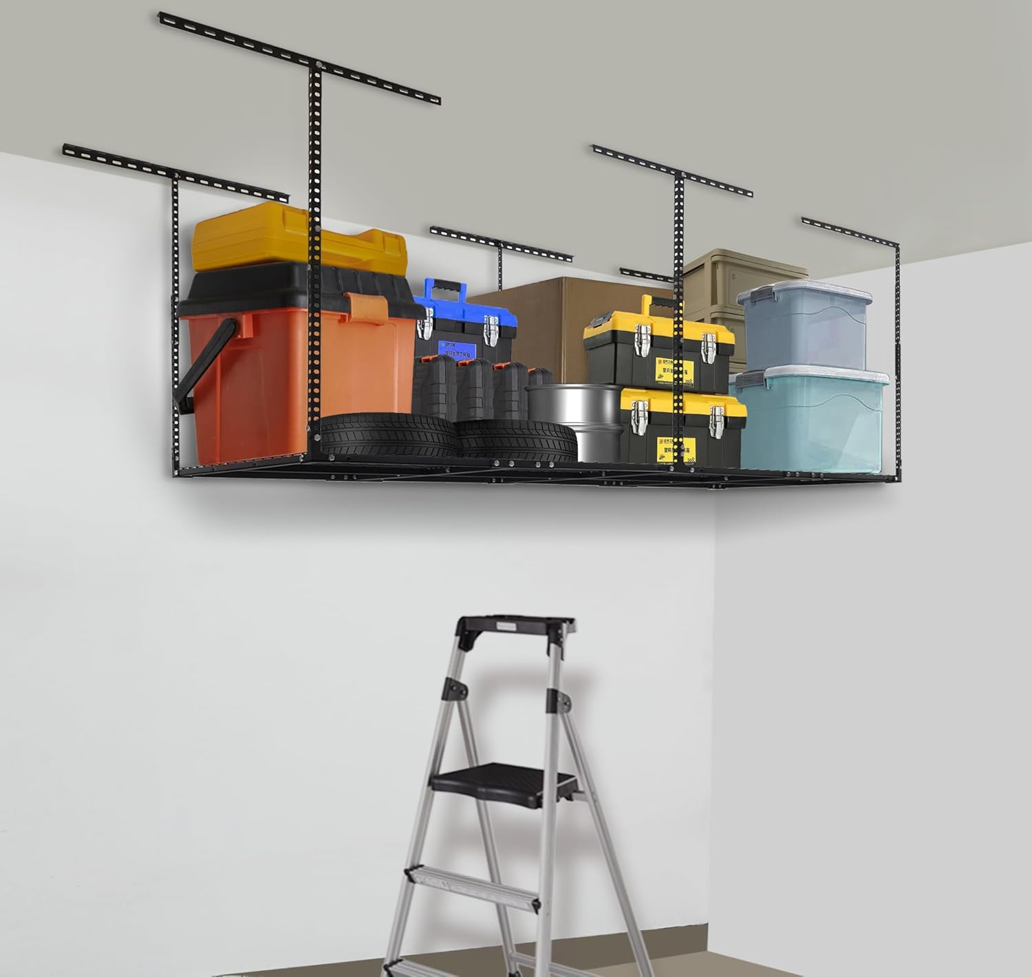 - MORE SPACE: Meet your storage needs with a ceiling mounted garage storage system for storing unused items. This hanging storage system is a great space saver, providing you with more storage space and better organization.