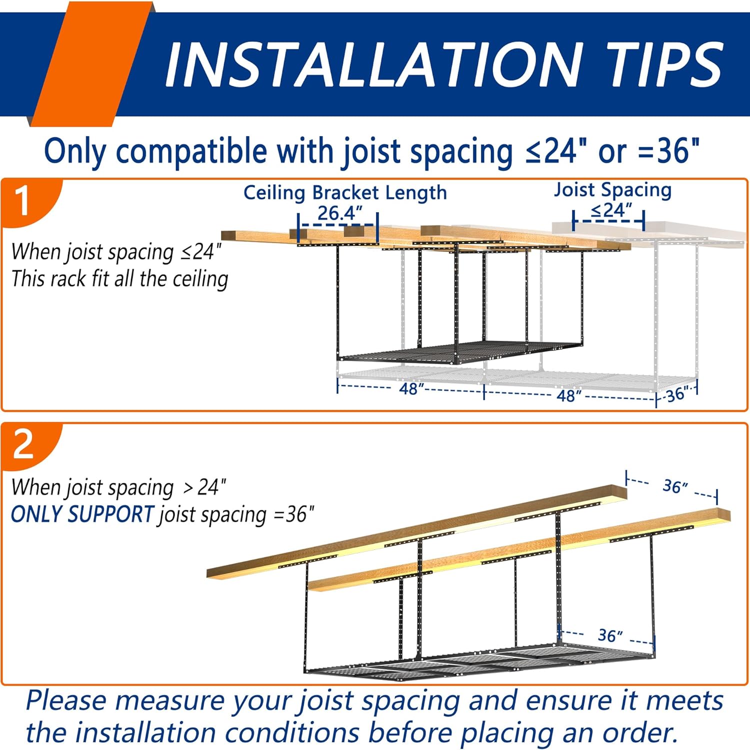 - ADJUSTABLE HEIGHT: Our garage storage racks are height adjustable, giving you the freedom to adjust the distance between the rack and the ceiling from 22 inches to 42 inches. This 3 FT x 8 FT ceiling mount rack adds up to 82 cubic feet of storage space.