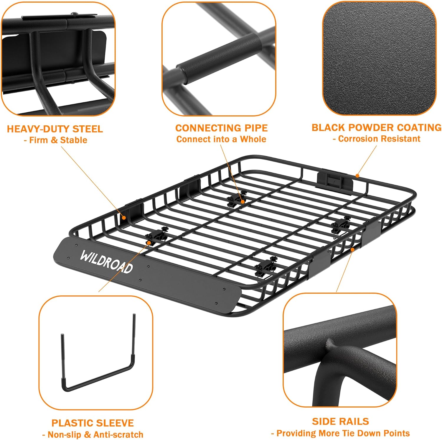 - [HEAVY DUTY]: Wildroad roof basket made of solid and premium steel pipe can hold up to 150 lbs cargo. Durable black powder coating prevent it from all weather conditions. Highest standard craftsmanship in the industry ensure its quality, each screw matches welding frame accurately.