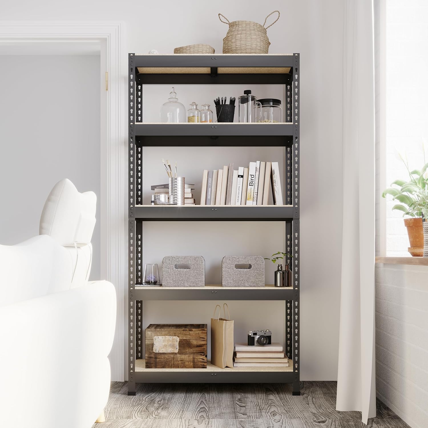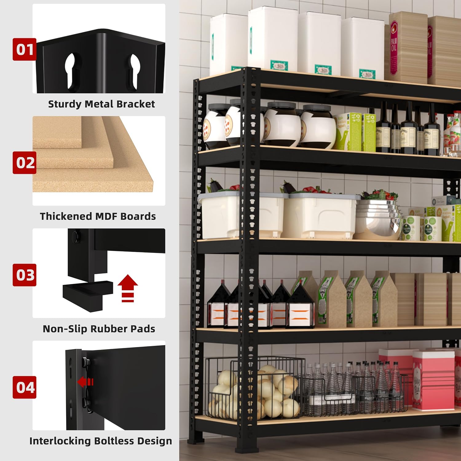- - Built to Hold More: Featuring a heavy-duty metal frame and premium MDF boards, BuxWellBang garage storage shelves Max. load capacity is 300 lbs per layer shelf (evenly distributed) without buckling or breaking, 5 tier shelves' total max load capacity is 1500 lbs. The rock-solid construction of storage shelf ensures greater strength, longevity, and stability—a storage rack you can trust for the long haul