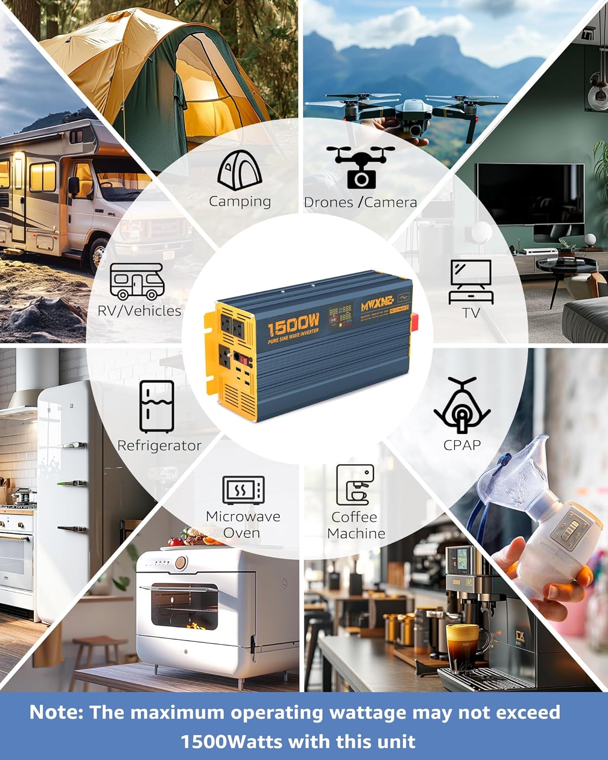 - 【24 MONTHS WARRANTY & FULL SET】 MWXNE Team offers 24 months warranty. Package includes 1x 1500W Pure Sine Wave Inverter, 1x User Manual, 2x Battery Cables, 1x Wireless Remote Controller, 1x Wired remote controller, Some Fuses, 1x Spanner, 1x Earth Wire. We provide 24/7 customer service. Please contact us by email if you have any question.