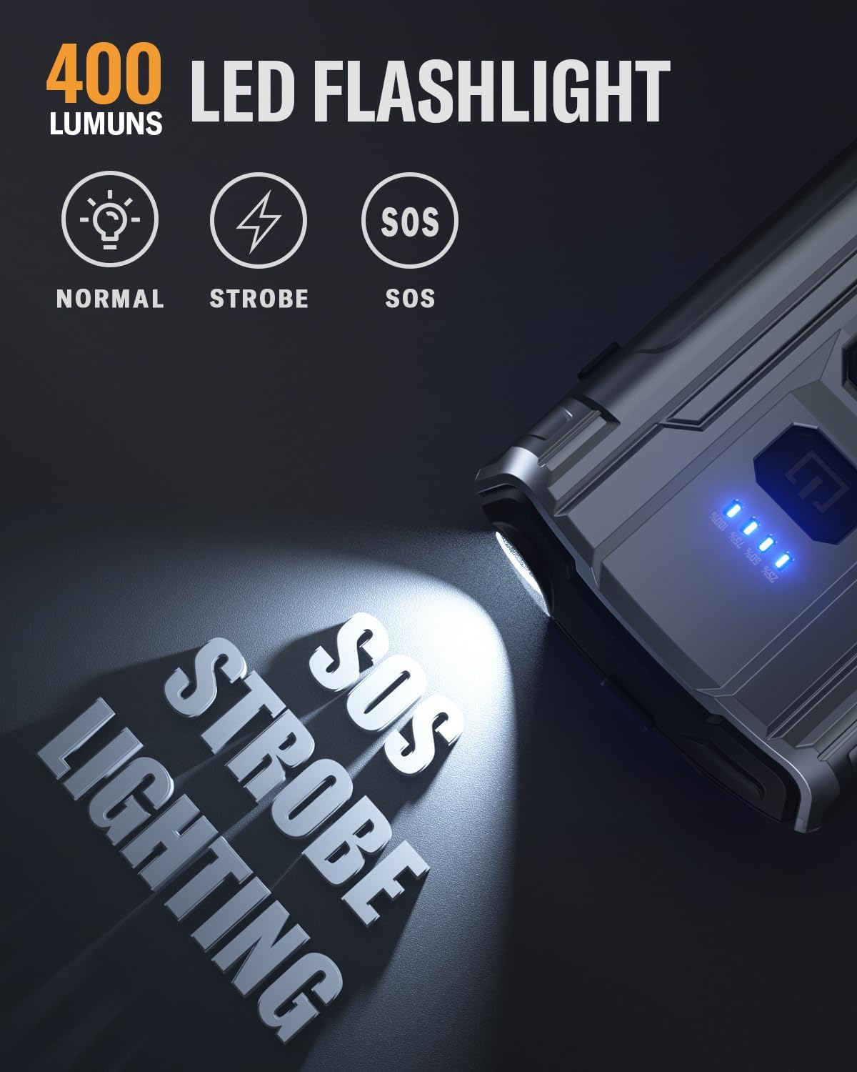 - 【400 LUMENS LED LIGHT】The jump starter battery pack is equipped with 400 lumens bright LED light that can last up to 48 hours. The luminous area is 2 times larger than other jump starters. 3 modes (flashlight/strobe/SOS) for different emergency situations.