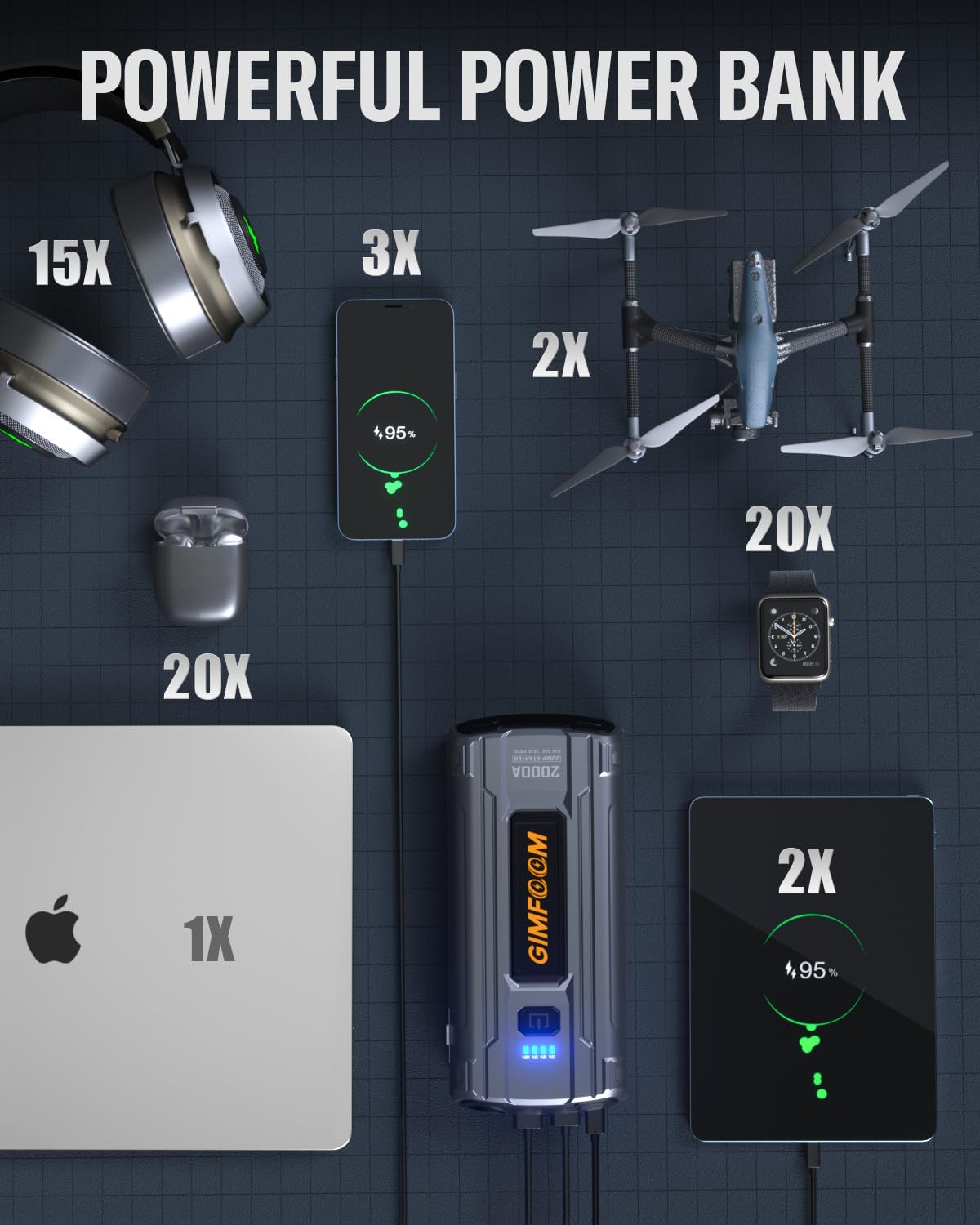 - 【DUAL USB FAST OUTPUT】 The portable car jump starter is equipped with 2*USB ports (5V/3A & 5V/2.4A) fast output design. In addition, the jump pack can quickly charge your headphones, cell phones, tablets, drones, cameras, and other USB devices and more.