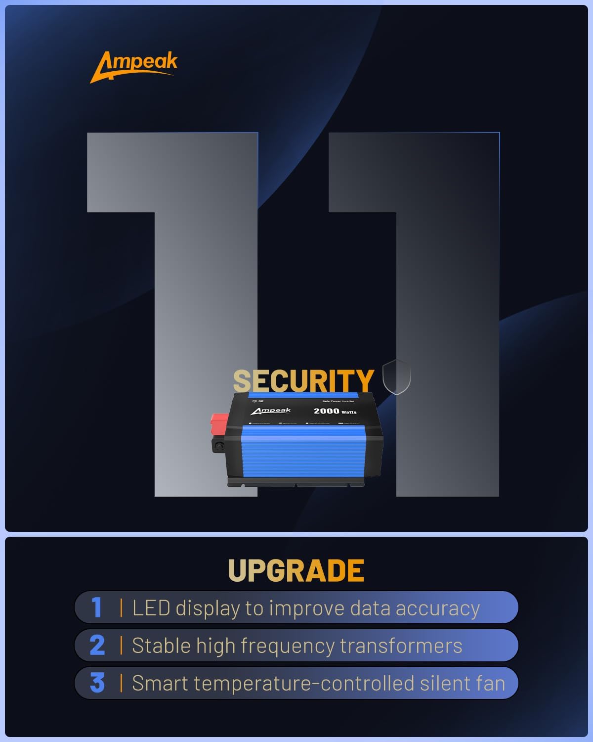 - 11 Safety Protections: Ampeak prioritizes safety with 11 built-in protections, ensuring your power inverter and devices operate safely and reliably—more than double the protections of most other inverters.