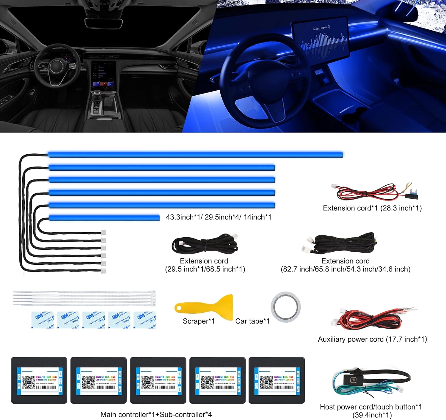 - 【High Bright & Uniform】The Acrylic Car Ambient Lighting have super bright LED and acrylic lens and contains 6 LED strips (4*29.5inch+1*43.3inch+1*14inch), also comes with 1 main controller and 4 sub controllers,and can be flexibly installed on any car by DIY without disorganized, which is plug and play, and this acrylic light evenly spread over the lamp strip is brighter, more uniform and softer than other optical fiber lamps that rely on only one LED.