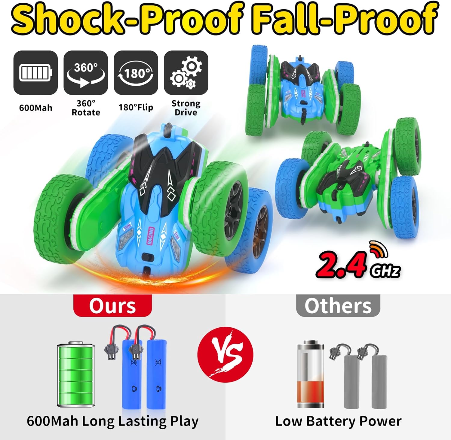 - [Rich Features] Remote control stunt car with not only with the conventional remote control car moving back and forth, left and right rotation, but also with cool lighting effects, 360° flip or rotation, and even can drive on double sides, or a unique dual color (blue and green). Multi-functional remote control car toys let everyone who likes remote control cars enjoy the joy of stunt cars, boys toys for 6, 7, 8, 9, 10, 11, 12 years old.