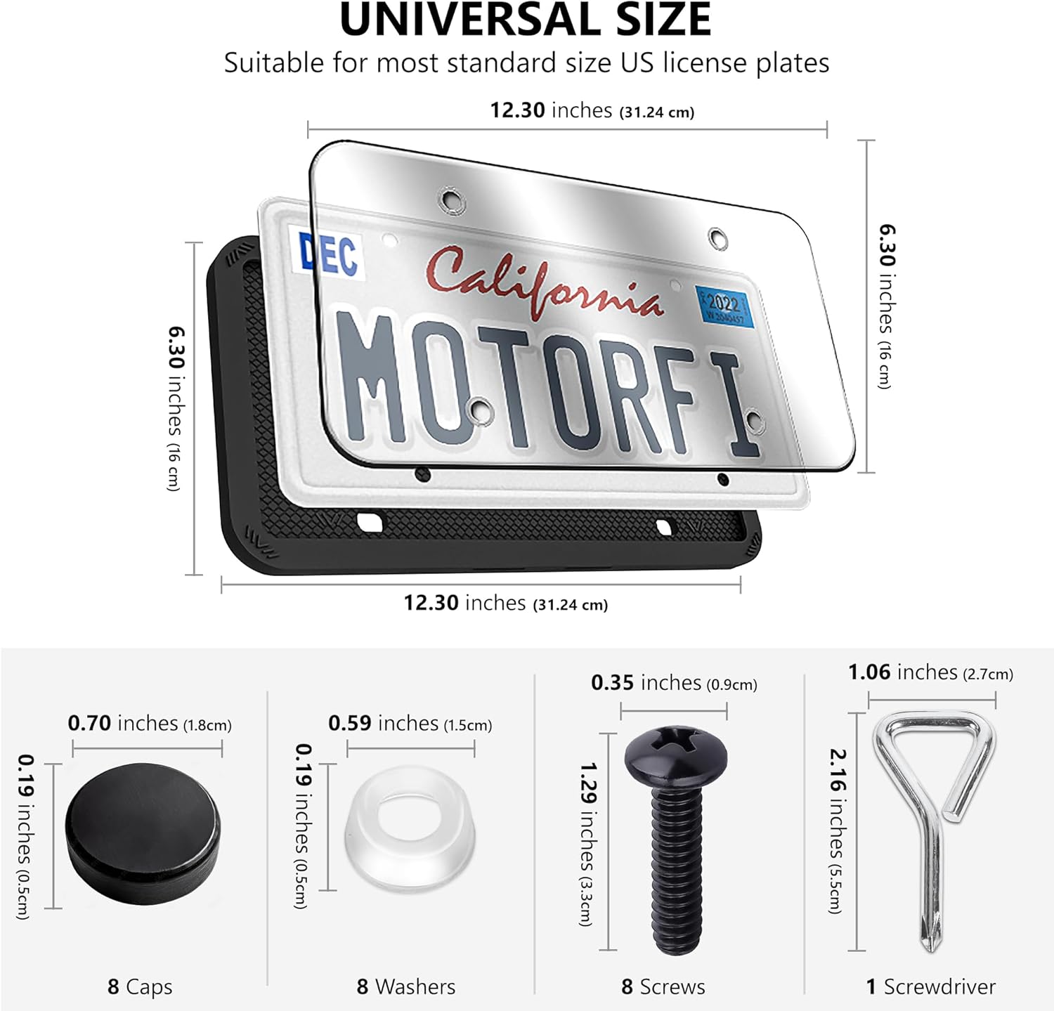 - VALUE FOR MONEY PACK: The product package includes two black silicone license plate frames, eight black stainless steel screws, eight screw caps, and two polycarbonate plate cover for car. This variety of items in the package offers buyers exceptional value