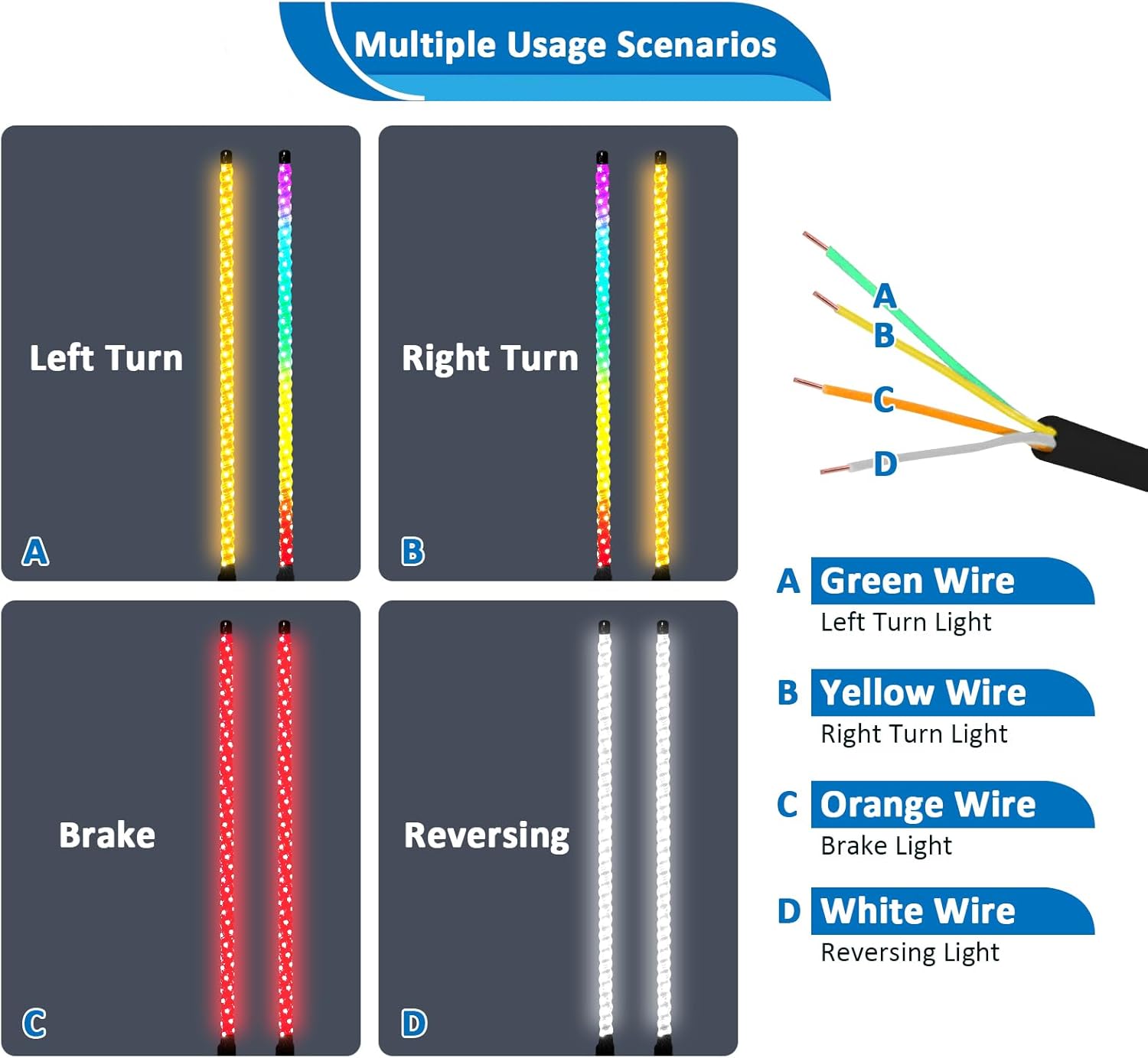 - [User-Friendly Operation] - This 4FT RGB LED Whip Light can be operated via controller which is more convenient and user-friendly. Through it allows you to operate at a range of 50ft easily, The controller meets the inconvenience of your cell phone.