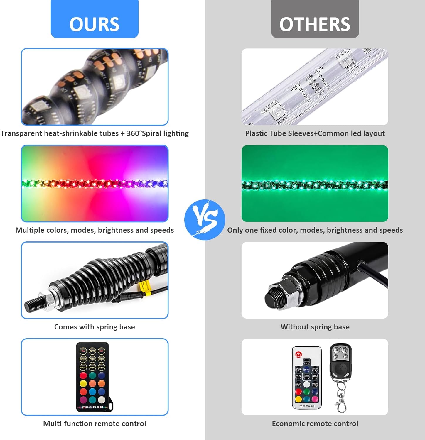 - [Durable Construction] - Made of high-strength silicone and a transparent heat shrink tube, the spring-loaded shockproof base and IP67-rated waterproof design could further enhance durability. Our RGB LED Whip Light is built to withstand the toughest outdoor conditions, letting your outdoor adventures no worries.