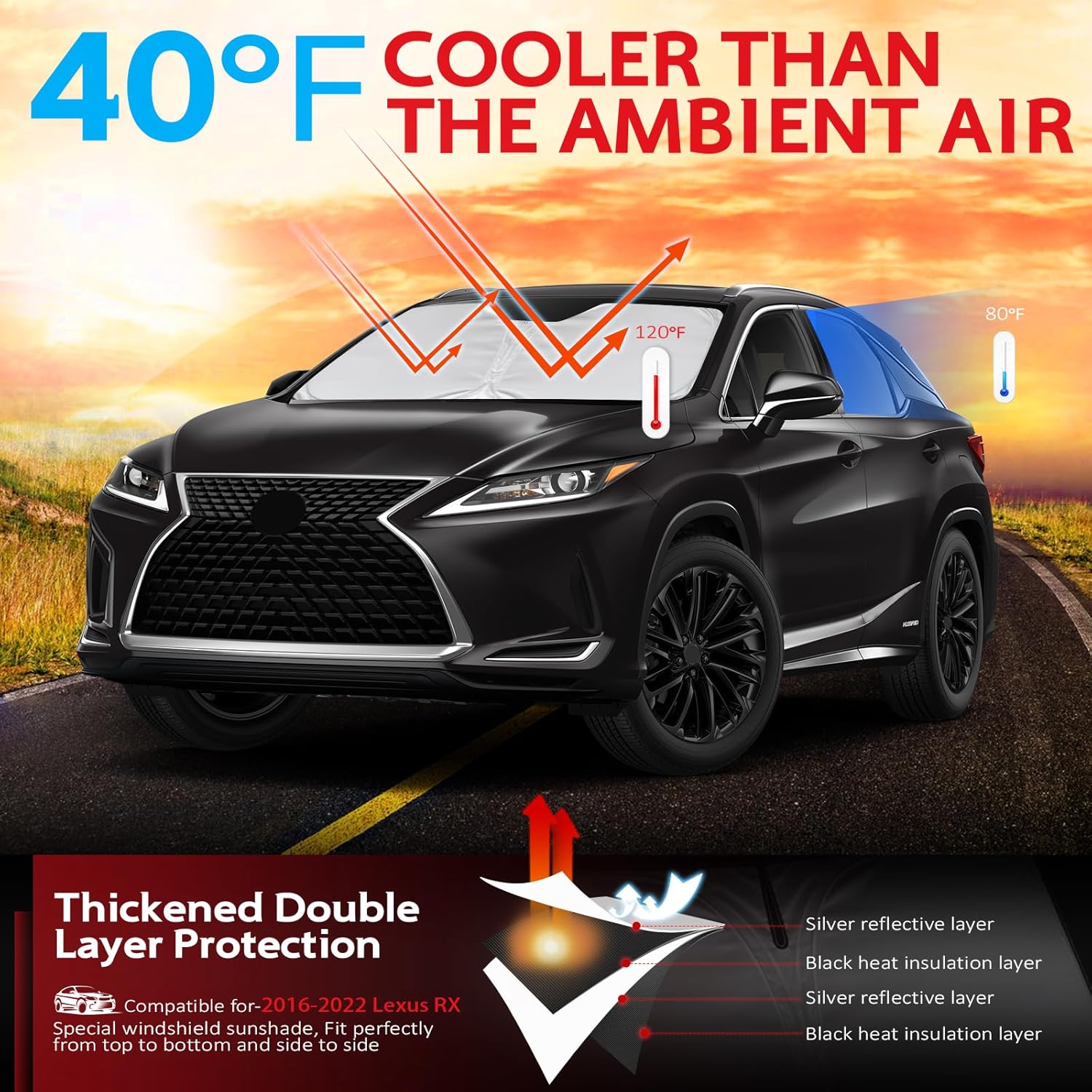 - KAYZT windshield sun shade is precise custom fit for 2016 2017 2018 2019 2020 2021 2022 Lexus RX, Thoroughly covers every corner of the windshield, Tailored to accommodate rear view mirror, Ensuring a seamless and snug fit without obstruction, Must have car accessories for Lexus RX