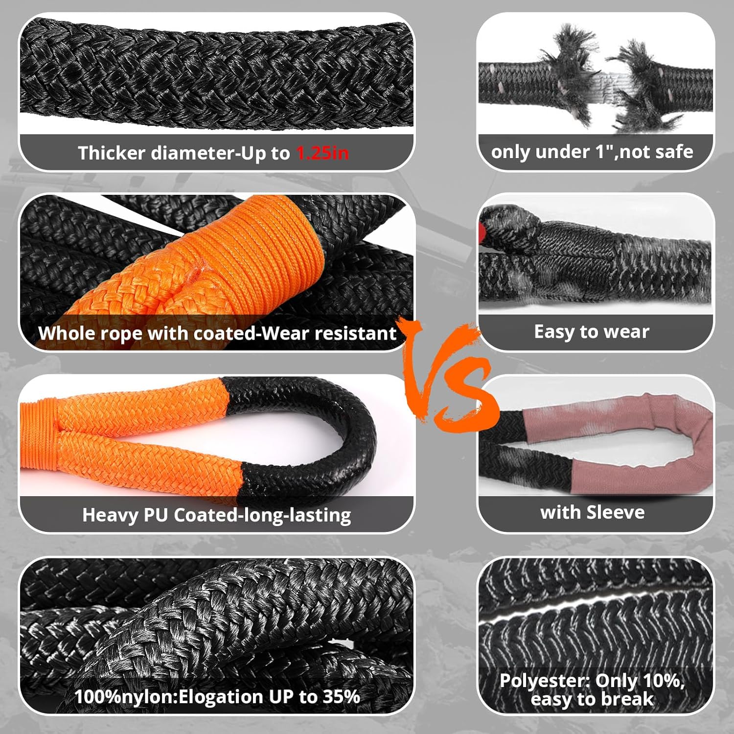 - Enhanced Heavy-Duty Towing Gear: 1 INCH UPGRADED TO 1.25 INCH, our ultimate recovery rope turn to sturdier and stronger. Lab tested and certified up to 54000LBS breaking strength, outperforms wire winch ropes by 45%.Stretching and storing four times the energy compared to a tow strap, efficiently recovers vehicles of all sizes including Jeeps, off-roader, SUVs, boats, ATVs, trucks, trailer recovery/towing/snatch straps, tractors, pickups, farming, tree savers, and sport-utility vehicles,etc