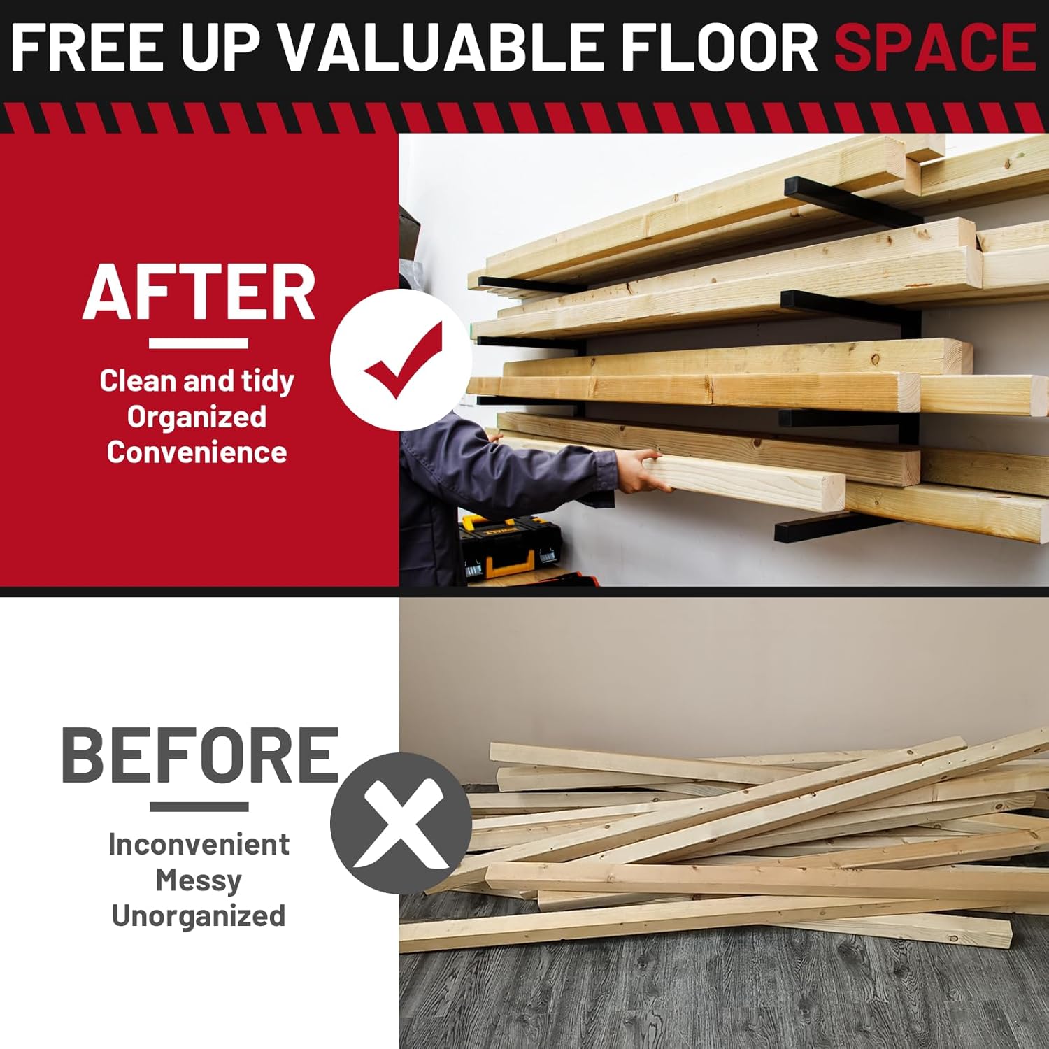 - 【4 LEVELS OF STORAGE】The wood organizer is 24.5'' high and 15'' deep, perfect for storing lumber, firewood, sheet metal, PVC, pipes, ladders, skis, snowboards, golf clubs or add wooden boards to the shelves to store more.