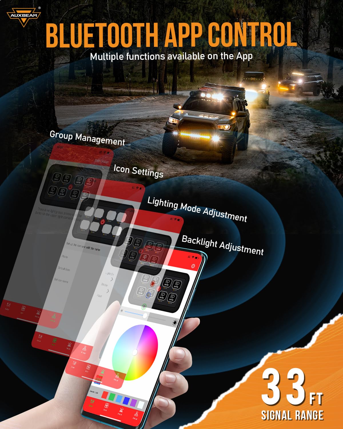 Auxbeam 8 Gang Switch Panel AR-820 Bluetooth RGB Switch Pod Automatic Dimmable Multifunction Switch w/Toggle Momentary Pulsed Control Panel for UTV ATV Truck Car RV Boat Waterproof 2 Years Warranty