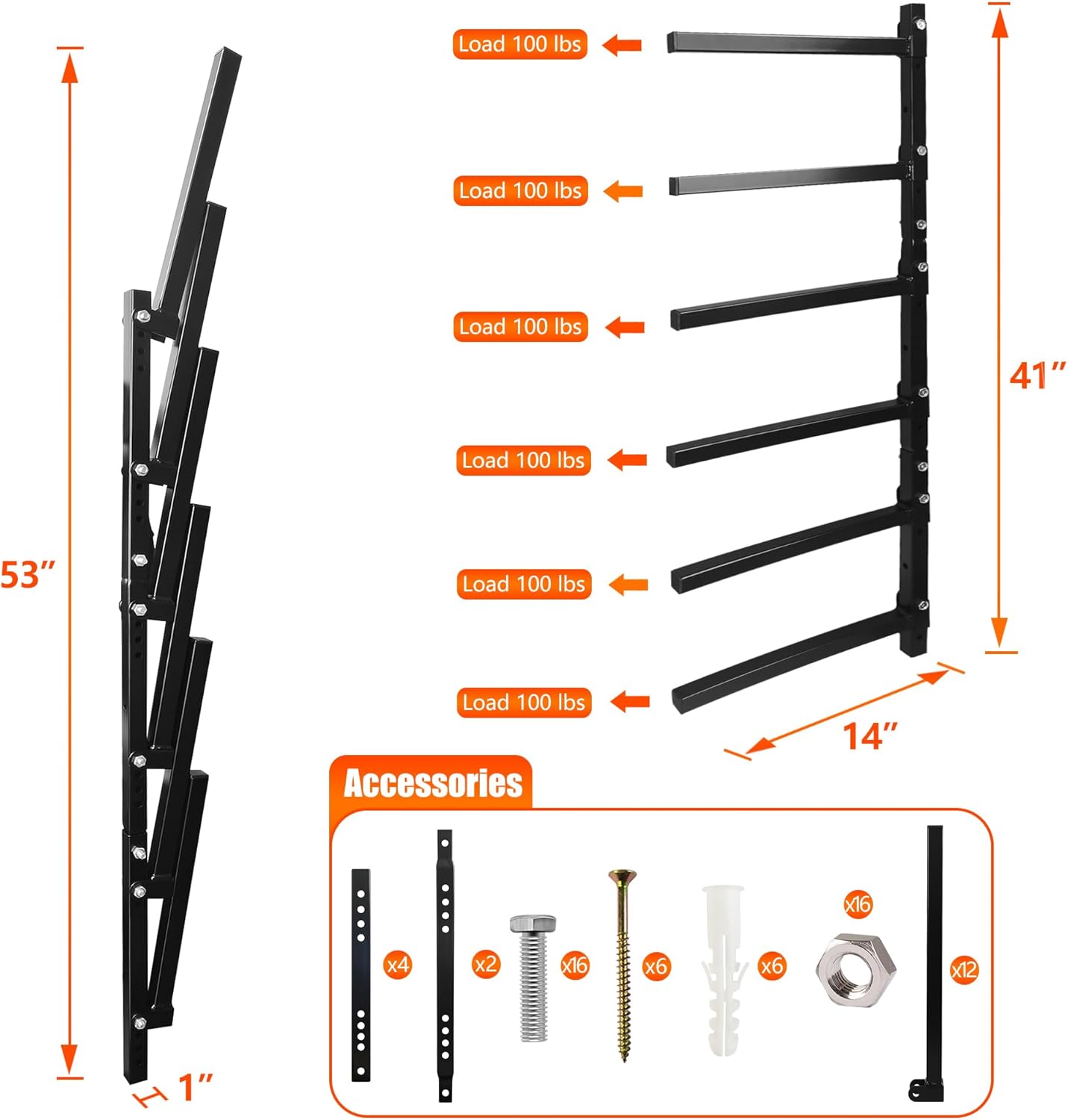 6-Tiered Collapsible Wall Mount Lumber Storage Metal Rack, 6-Level Foldable Heavy Duty Indoor Garage Wood organizer, Outdoor Adjustable Steel Multipurpose Workshop Shelf, Holds up to 600Lbs