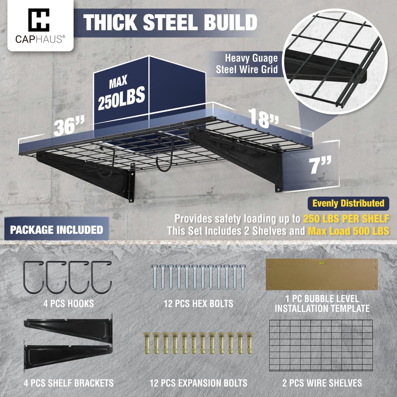 - 🔨 Various Size Choices - This option includes TWO wall shelves, FOUR Versatile hooks, and all necessary hardware. Each shelf measures 36 inches in width and 18 inches in depth, providing a total of 72 inches in width. Opt for the silver hex bolt for concrete and wooden walls and choose the golden expansion bolt for secure installation on brick walls. Heavy gauge steel construction provides safety loading up to 250lbs total per shelf, this set providing a total weight capacity of 500 lbs.